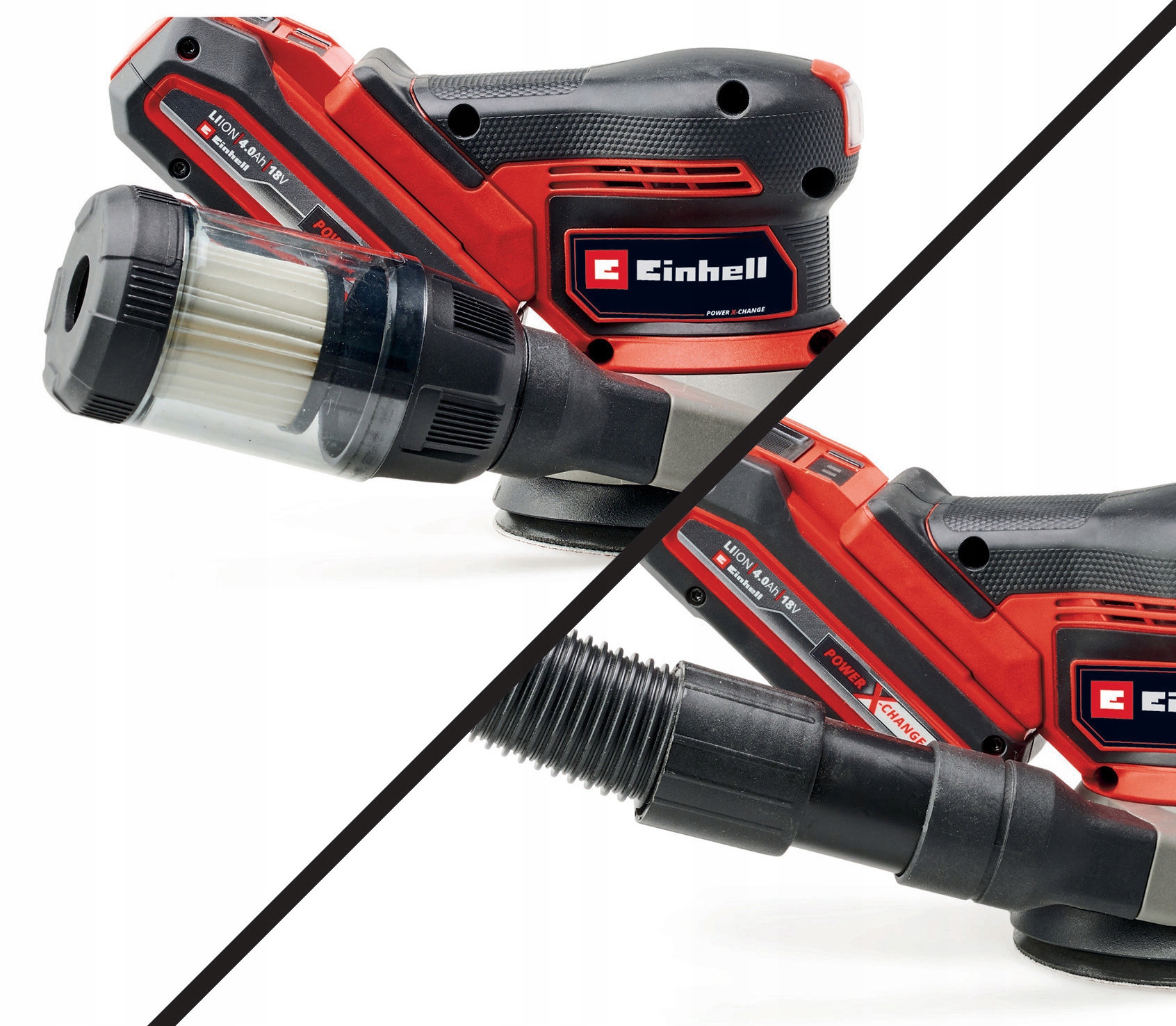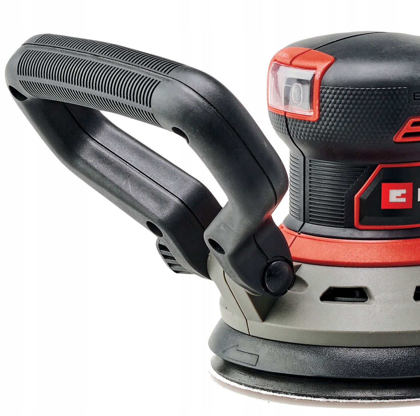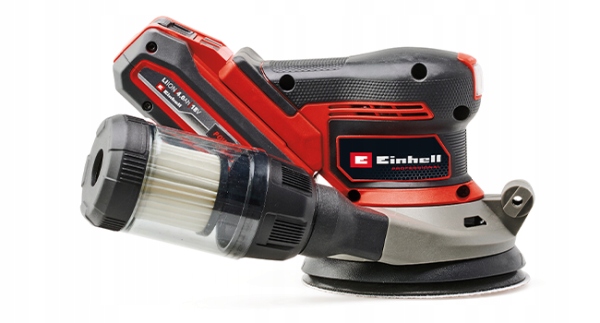 Szlifierka należy do rodziny Power X-Change, dzięki czemu jest kompatybilna ze wszystkimi akumulatorami i ładowarkami tej serii. Napędzana jest bezszczotkowym silnikiem Einhell PurePOWER, oferującym większą moc i dłuższy czas pracy niż tradycyjne silniki szczotkowe. Urządzenie ma płaską konstrukcję, ergonomiczne uchwyty Softgrip oraz odłączany dodatkowy uchwyt, co ułatwia kontrolę. Średnica talerza szlifierskiego to 125 mm, a papier ścierny mocowany jest przy pomocy mikrorzepu. Szlifierka posiada zintegrowany system odsysania pyłu z pojemnikiem i filtrem harmonijkowym oraz opcję podłączenia zewnętrznego odkurzacza, np. Einhell do pracy na sucho i mokro.