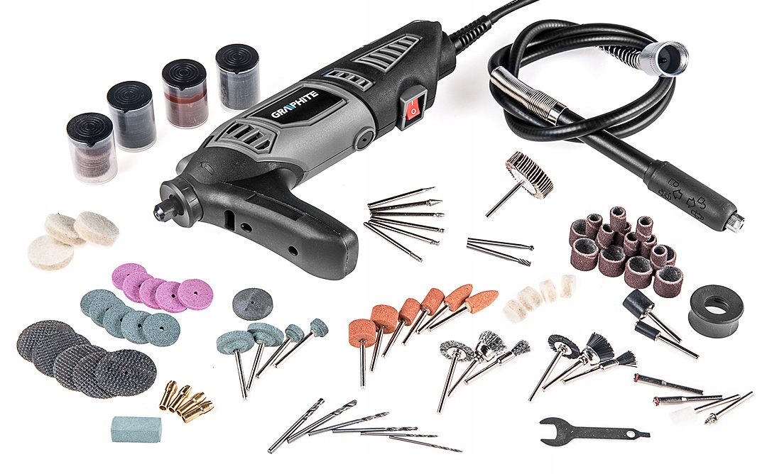 Miniszlifierka GRAPHITE o mocy 170W(nr. Ref. 59G019) to funkcjonalna i poręczna miniszlifierka o szerokim zastosowaniu. Umożliwia cięcie, szlifowanie, polerowanie a także wiercenie w różnych materiałach. Posiada lekką i ergonomiczną budowę oraz wydajny silnik o mocy 170W umożliwiający wykonywanie szerokiego zakresu prac warsztatowych. Miniszlifierka wyposażona jest w płynną regulację obrotów w zakresie od 8000 do 35000 obr./min.Dostarczana w estetycznej walizce z tworzywa sztucznego oraz poliwęglany. Miniszlifierka posiada bardzo bogaty zestaw akcesoriów, takich jak kamienie szlifierskie, frezy diamentowe, wiertła, osełka, filce polerskie, głowica i taśmy do szlifowania oraz tarcze tnące łącznie jest to 190 elementów. Urządzenie wyposażono w elastyczny i wytrzymały przewód zasilający w powłoce gumowej o długości 3m, dedykowany także do zastosowań profesjonalnych i przemysłowych zarówno wewnątrz jak i na zewnątrz pomieszczeń. W składa wyposażenia wchodzą dodatkowy uchwyt ułatwiający pracę urządzeniem oraz elastyczny wałek do precyzyjnych prac.