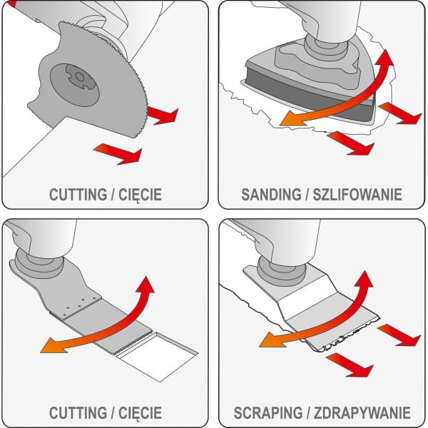 - Załączony zestaw akcesoriów pozwala ciąć, szlifować i zdzierać kleje, powłoki lakiernicze i inne materiały.