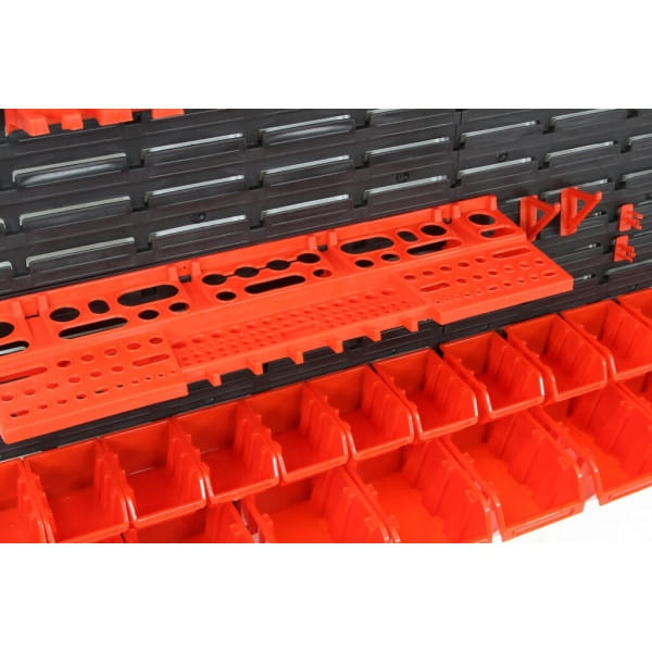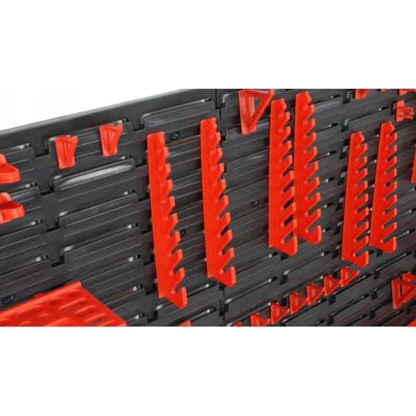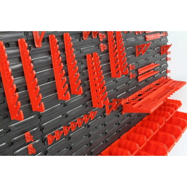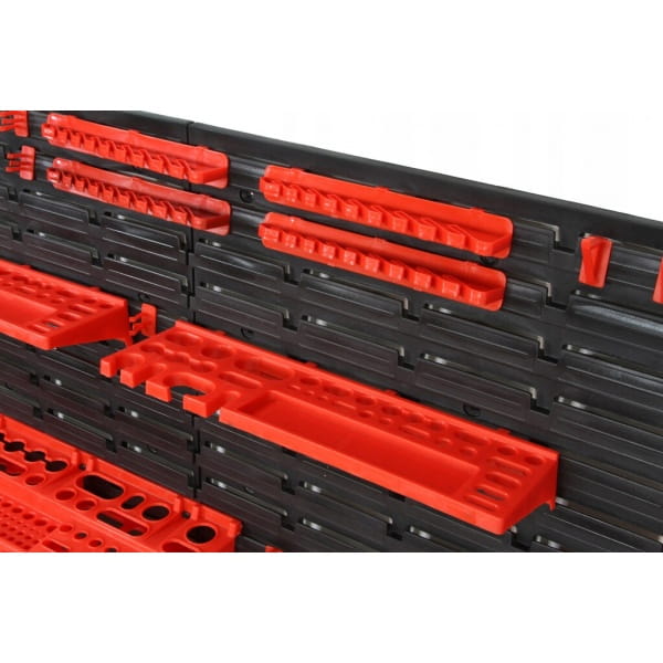 Świetny dodatek stanowią wytrzymałe uchwyty i półki narzędziowe pomagające przechowywać dłuższe narzędzia tj. młotek, wiertła, klucze, śrubokręt czy kombinerki. Dzięki uchwytom najważniejsze narzędzia będą zawsze pod ręką i zajmą znacznie mniej miejsca w warsztacie. Praktyczne oraz świetnie wyglądające rozwiązanie.