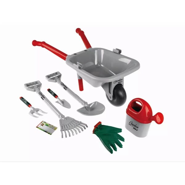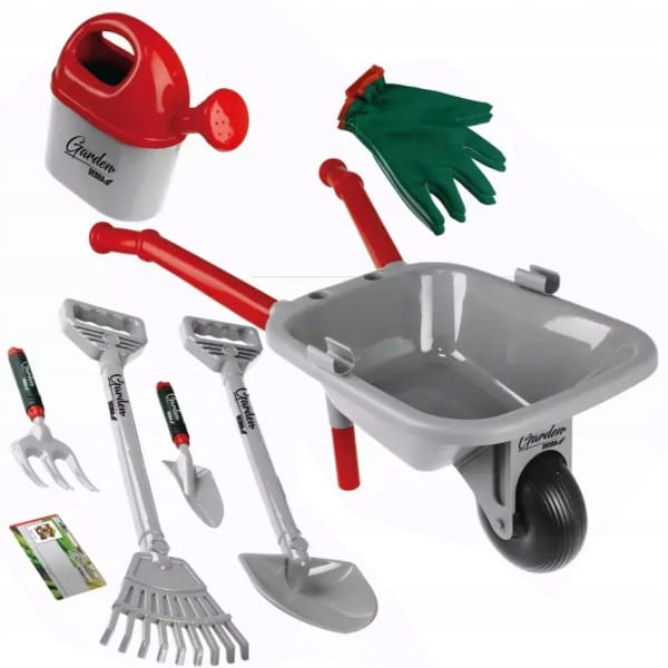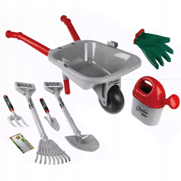 W zestawie znajduje się taczka, łopata, grabie, małe grabki, mała łopatka, konewka, rękawice dziecięce oraz papierowa wizytówka - cały taki komplet sprawia, że nasza pociecha może poczuć się jak prawdziwy ogrodnik!