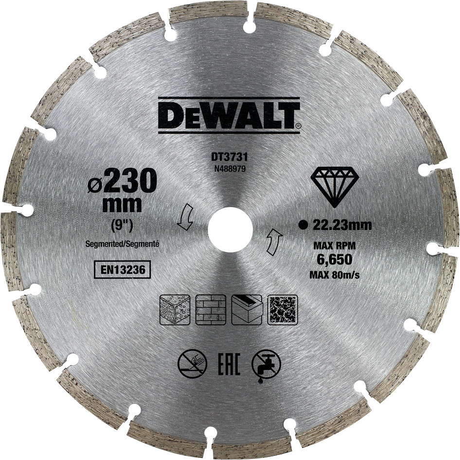 Tarcza diamentowa do cięcia na sucho, przeznaczona do stosowania ze szlifierkami kątowymi. Posiada segmentową krawędź umożliwiającą szybkie cięcie. Spiekany nasyp diamentowy ułatwia cięcie materiałów budowlanych na sucho. Opakowanie zawiera 1 sztukę. Zastosowanie: cięcie na sucho cegieł, bloków budowlanych, ceramiki, płyt chodnikowych, średniego betonu