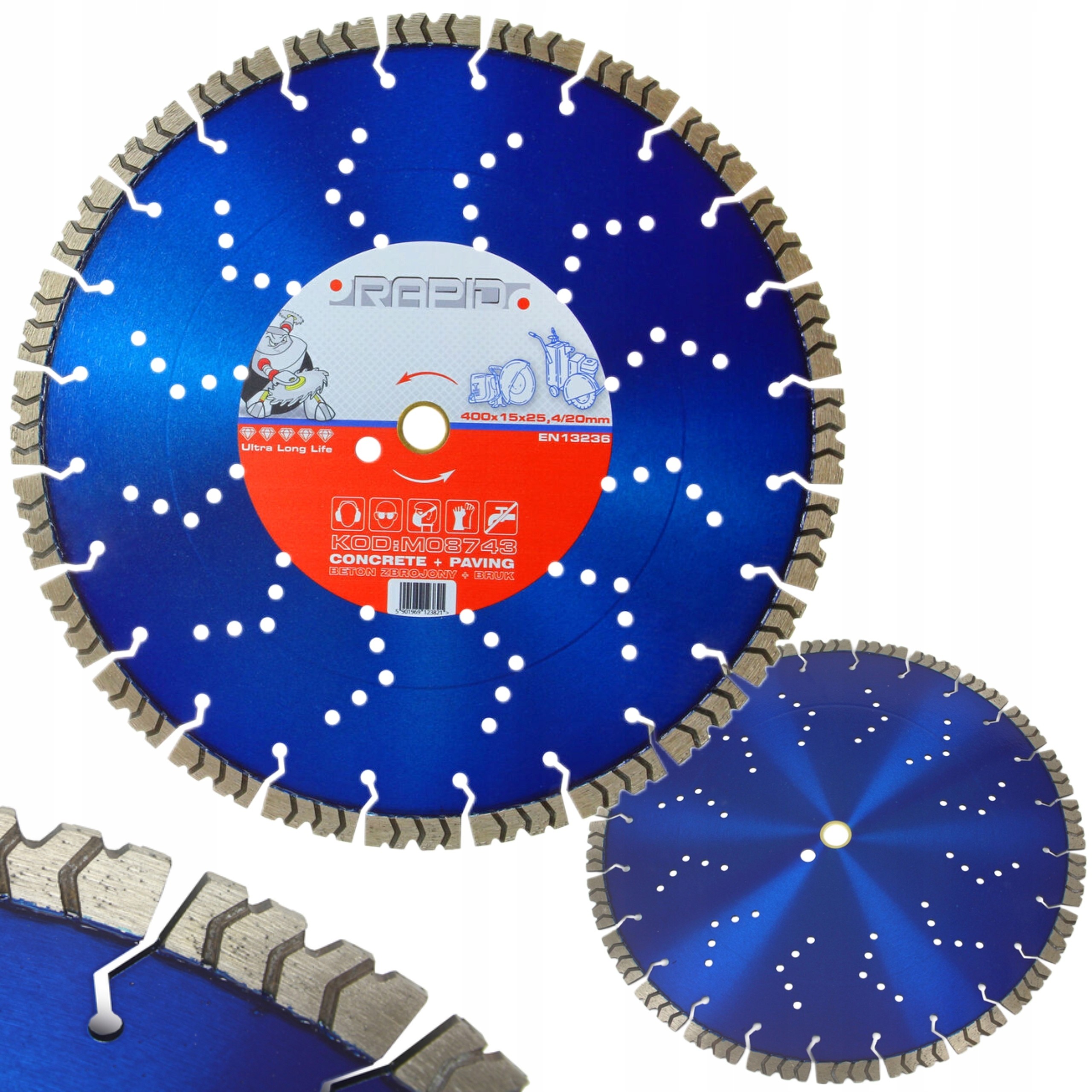 UNIKALNA laserowo spawana do czoła płaszcza ( zużywamy 100% nasypu ) Precyzyjnie zaprojektowany ząb pozwala na szybkie odprowadzanie pyłów i ułatwia lepsze chłodzenie tarczy. Dzięki innowacyjnemu projektowi, daje wyjątkowo szybkie cięcie i gwarantuje precyzję i długą żywotność. Wszechstronne zastosowanie tarczy do różnego rodzaju materiałów : kostka brukowa, cegła,beton, beton zbrojony, twarde materiały i ogólnie pojęte materiały budowlane.