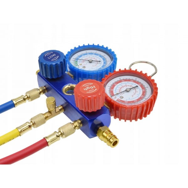 Oba wskaźniki wysokiego i niskiego ciśnienia można skorygować do zera. Skale rozgałęziacza są cechowane w stopniach temperatury i ciśnienia. Wymienne zawory tłokowe zapewniają perfekcyjne uszczelnianie, wypełnione gliceryną-olejem mierniki są wyposażone w zawór zwalniający ciśnienie bezpieczeństwa w przypadku narastania ciśnienia.