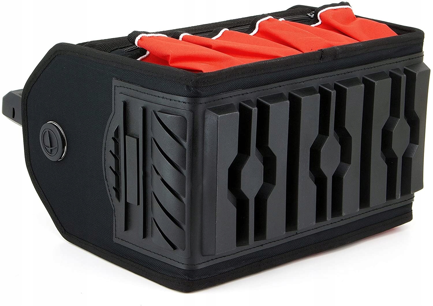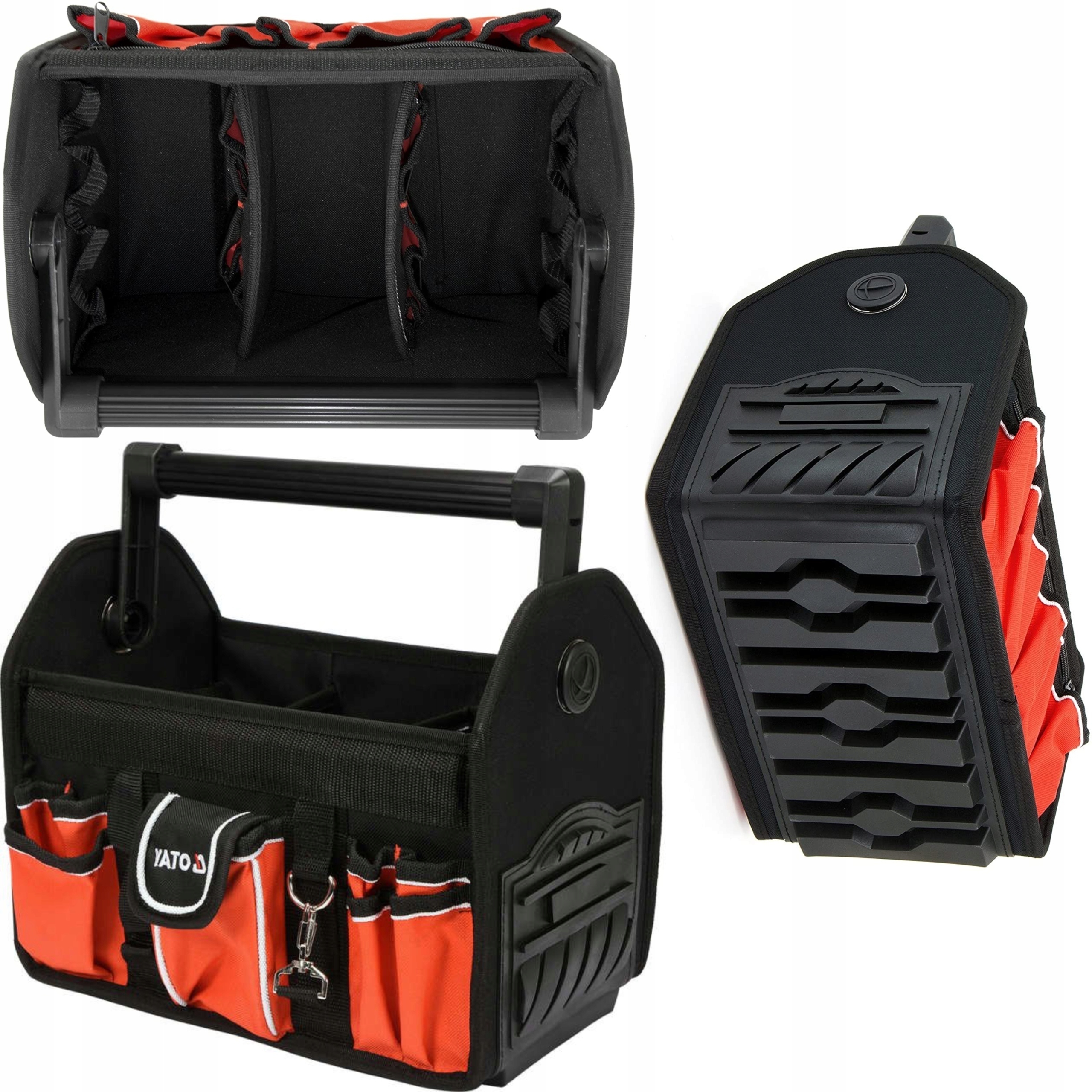 Duży , otwarty pojemnik narzędziowy, wykonany z technicznego poliestru 600 D. Dno pojemnika o wzmocnionej, odpornej na wilgoć konstrukcji. Można ją więc stosować w miejscach, gdzie panują mniej przyjemne warunki pracy. Szwy główne oraz kieszenie w wersji przystosowanej do dużych obciążeń. Centralny uchwyt wykonany z aluminiowej rurki z miękką antypoślizgową osłoną, wytrzymuje duże obciążenia i stabilizuje kształt pojemnika.
