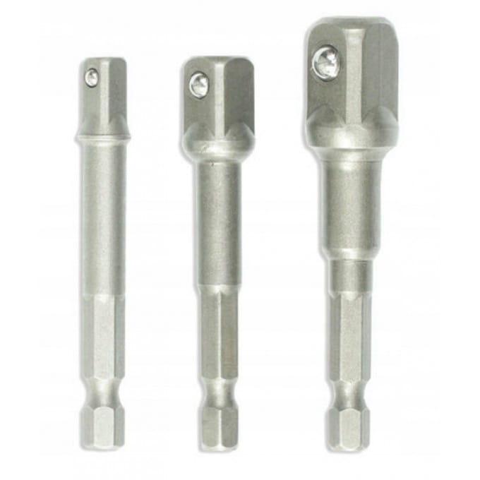 Zestaw 3 szt adapterów do nasadek o rozmiarze trzpienia 1/2", 1/4" oraz 3/8". Adaptery przystosowane są do pracy z wiertarko-wkrętarkami, wiertarkami oraz zakrętarkami. Adaptery wykonane z wytrzymałej stali chromowo wanadowej, która gwarantuje odpowiednią trwałość i odporność na korozje.