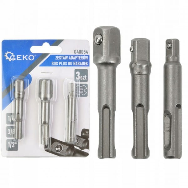 Adaptery wykonane zostały z wytrzymałej stali chromowo-wanadowej (CrV). Zestaw adapterów umożliwia stosowanie przy wiertarce z uchwytem SDS-Plus nasadek na 1/2”, 3/8” oraz 1/4”.