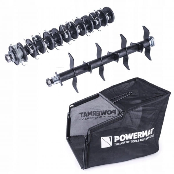 - Aerator / Wertykulator elektryczny Powermat PM-AEW-2550M napędzany jest silnikiem elektrycznym o maksymalnej mocy 2550W, zapewniającym odpowiednią wydajność pracy.