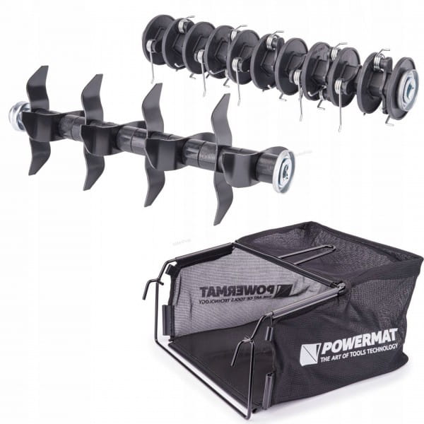 - Aerator / Wertykulator elektryczny Powermat PM-AEW-2550M napędzany jest silnikiem elektrycznym o maksymalnej mocy 2550W, zapewniającym odpowiednią wydajność pracy.