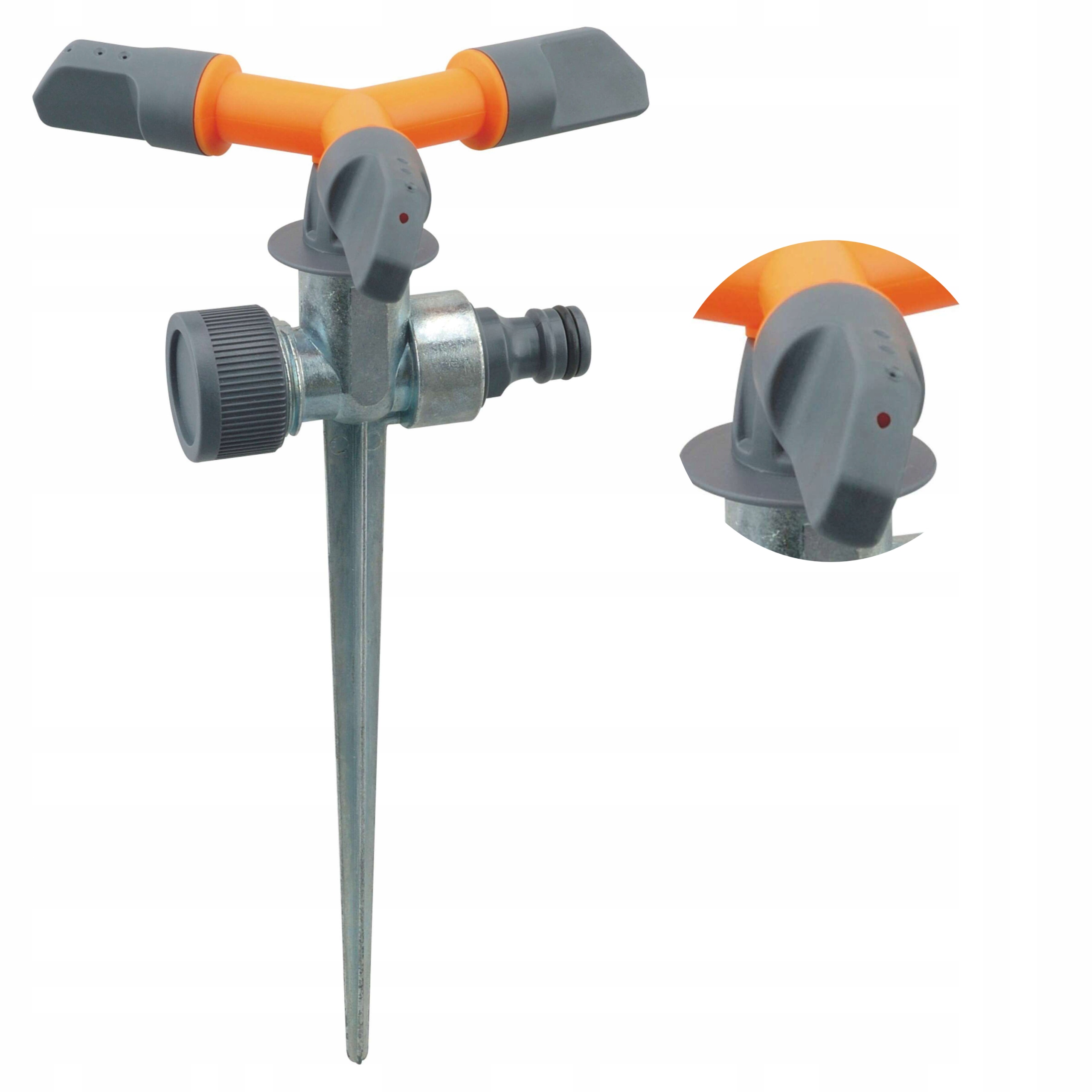 Zraszacz pulsacyjny, wbijany, plastikowy. Zraszacz pulsacyjny, metalowy, wbijany na przelotowym kolcu. Regulowana wielkość i kształt pola zraszania. Blokada dla spryskiwania wybranego sektora. Kolec posiada nypel do szybkozłączy i możliwość szeregowego połączenia z innymi zraszaczami.