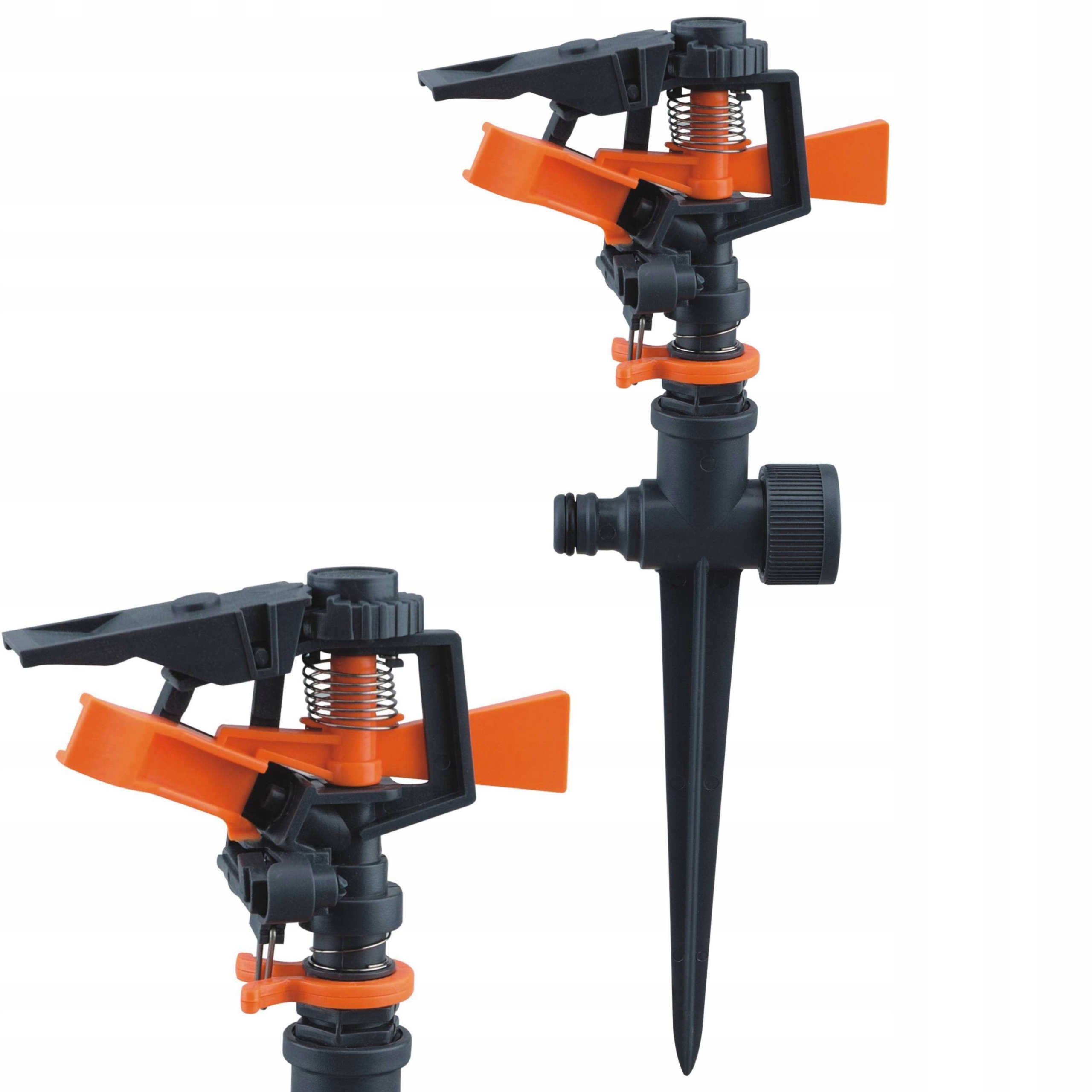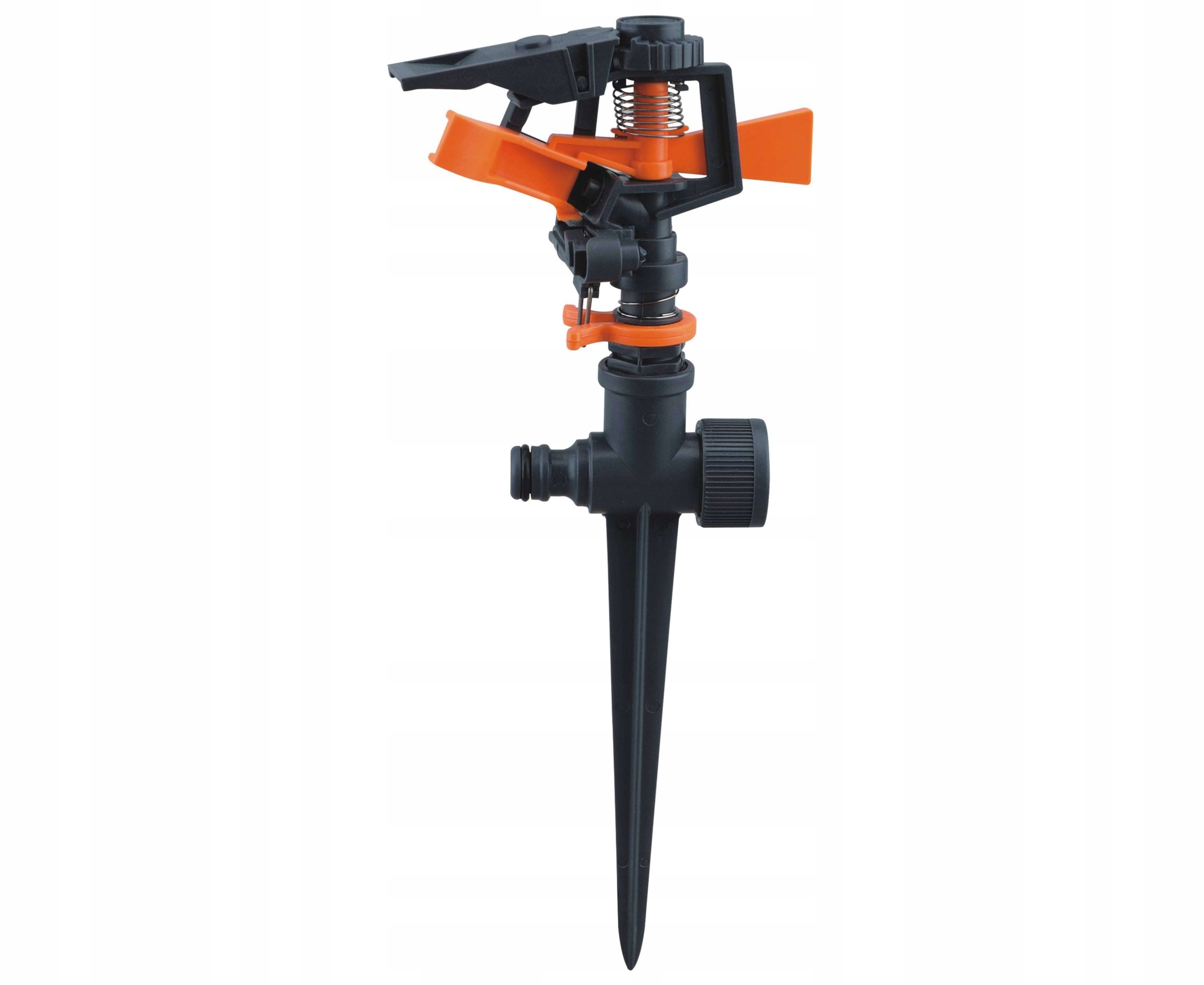 Zraszacz pulsacyjny, wbijany, plastikowy. Zraszacz pulsacyjny, metalowy, wbijany na przelotowym kolcu. Regulowana wielkość i kształt pola zraszania. Blokada dla spryskiwania wybranego sektora. Kolec posiada nypel do szybkozłączy i możliwość szeregowego połączenia z innymi zraszaczami.