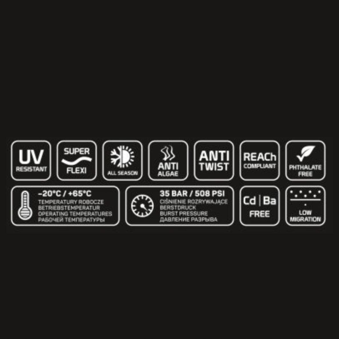 • Technologie: Super FlexiAnti TwistUV ResistantAnti AlgaeAll SeasonCd | Ba | Pb FreeFood Quality