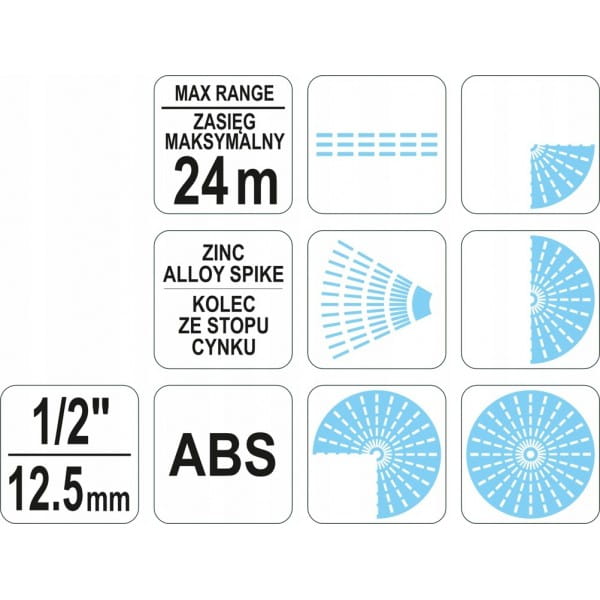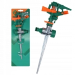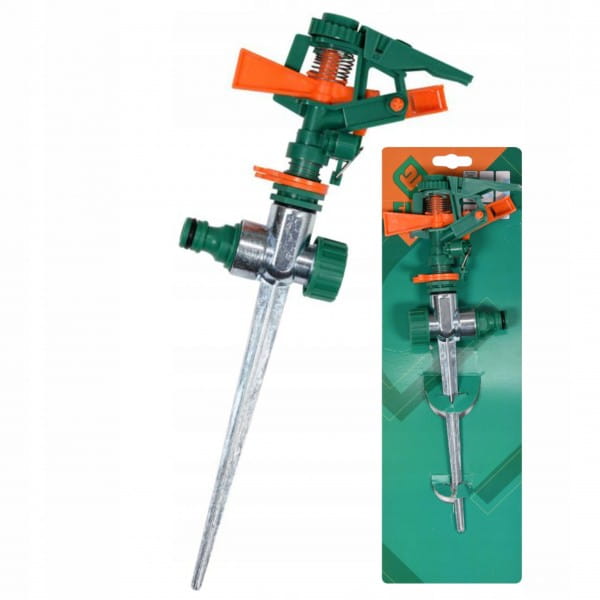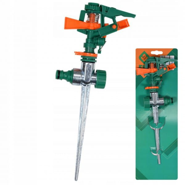 Zraszacz obrotowy, impulsowy wykonany z tworzywa ABS. Szpilka ze stopu cynku umożliwia łatwe i wygodne umieszczenie nawet na bardzo zbitym podłożu trawnika.