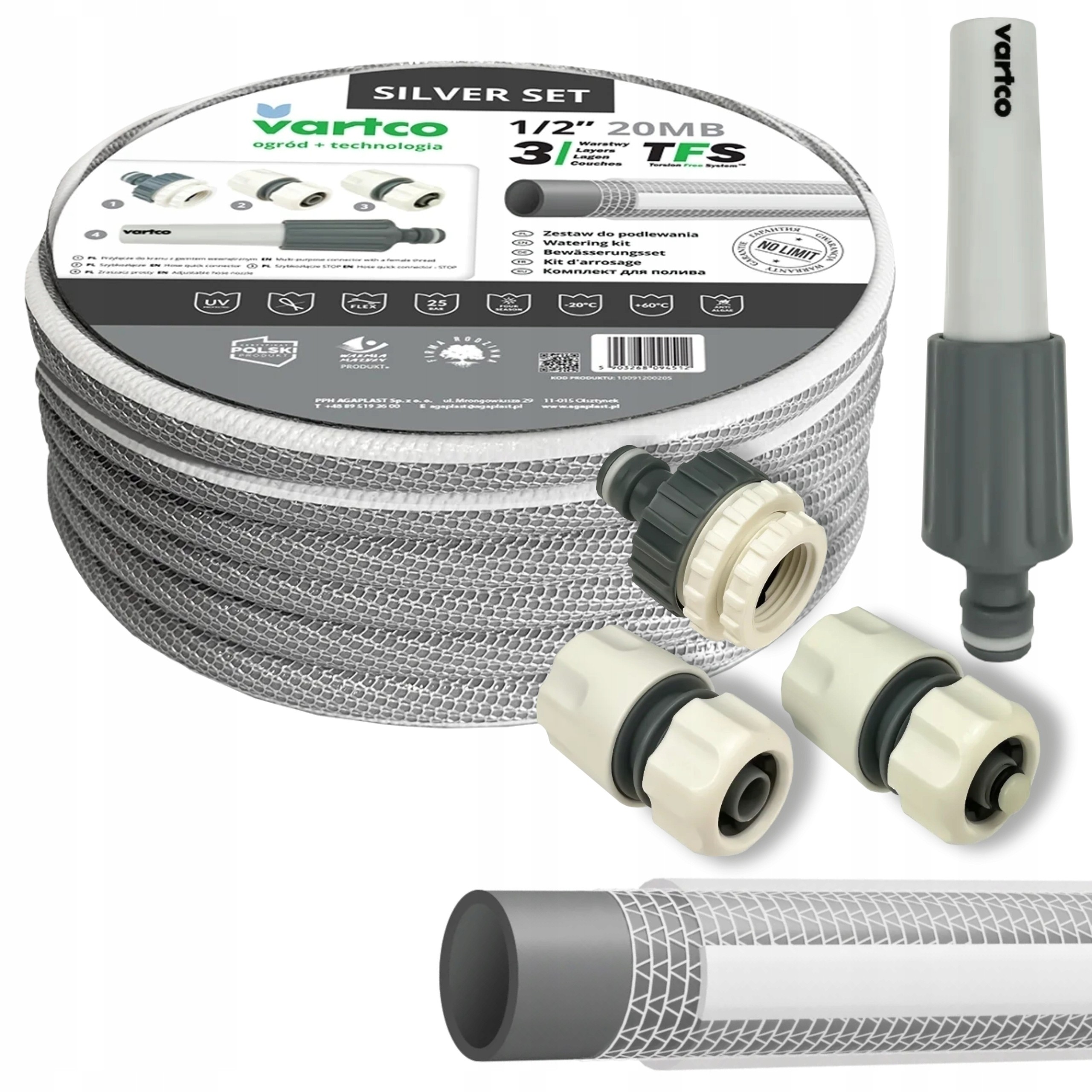 ZESTAW WĄŻ OGRODOWY 3-WARSTWOWY 25BAR 1/2'' 20M SILVER SET + ZŁĄCZKI POLSKI