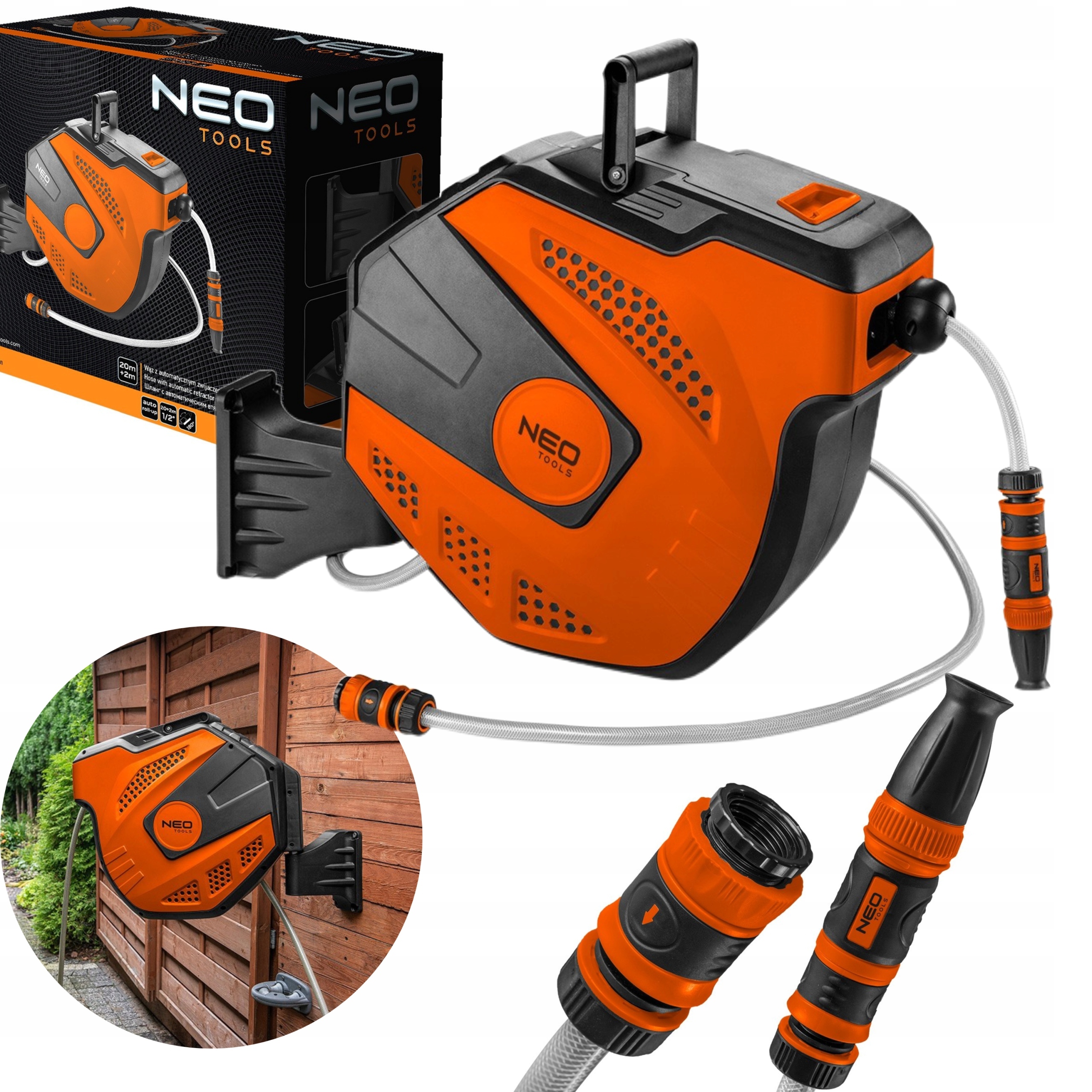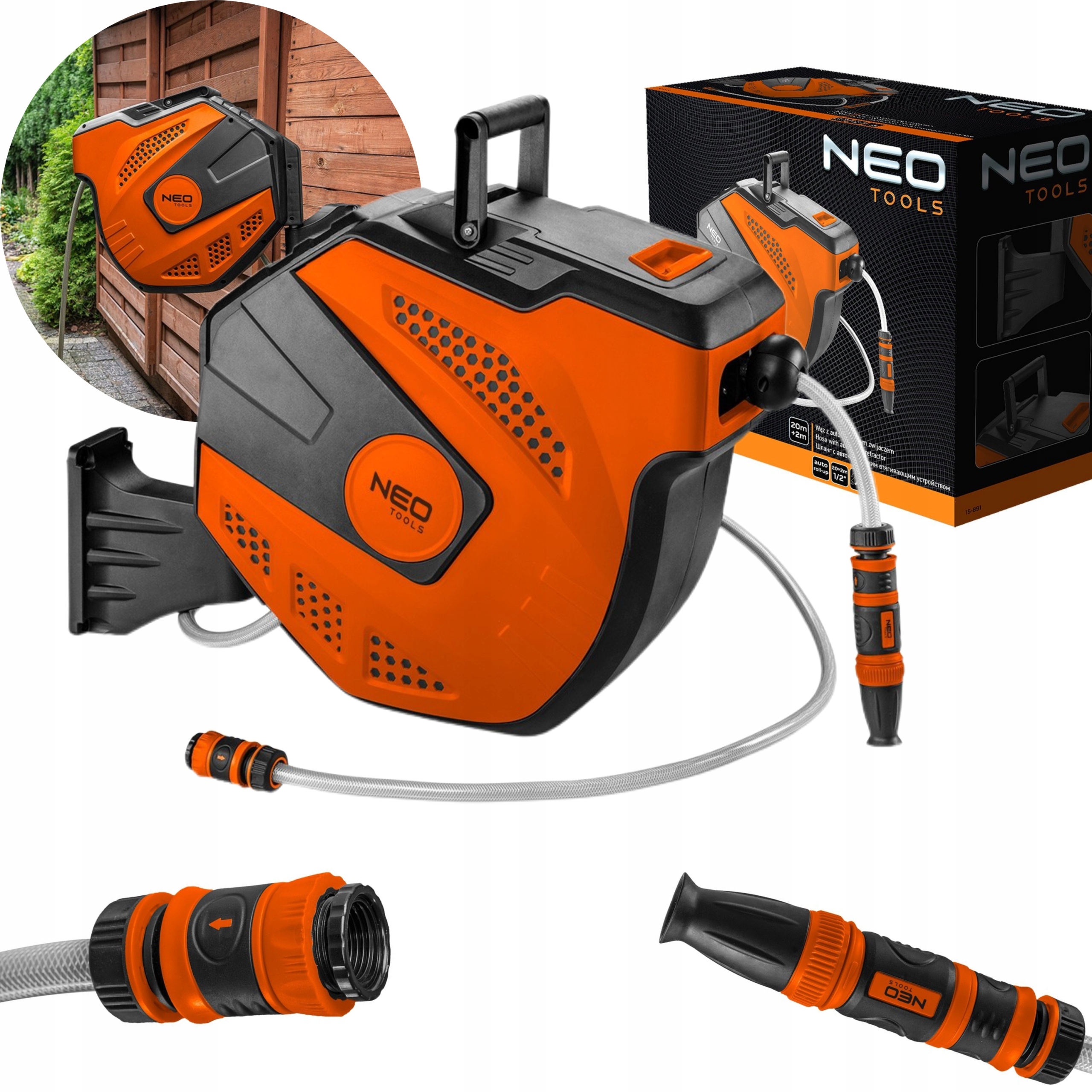 NEO WĄŻ OGRODOWY Z AUTOMATYCZNYM ZWIJACZEM 1/2" 20 M +2M 15-891