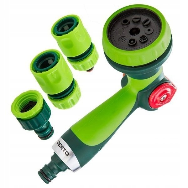 Zestaw z pistoletem zraszającym, złączkami jednomateriałowymi, przyłączem do kranu VERTO (nr ref. 15G712). Zestaw składa się z 4 elementów: zraszacz z płynną regulacją strumienia 8-funkcyjny, złączka przelotowa 1/2", złączka stop 1/2", przyłącze do kranu 1/2".