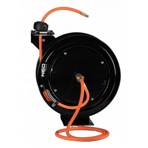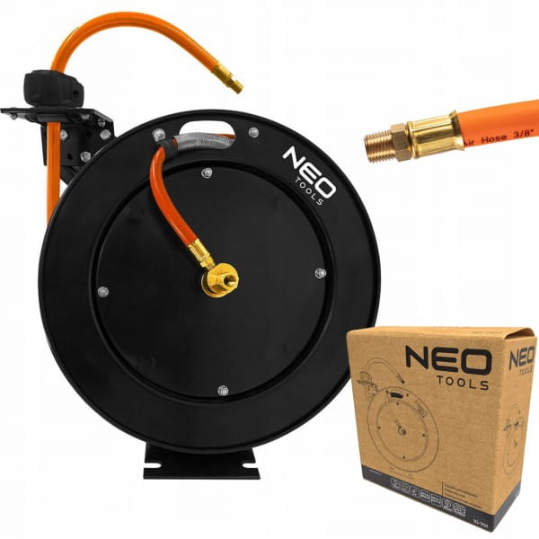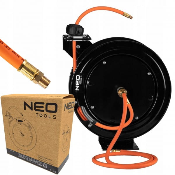 Zwijadło pneumatyczne, metalowe, otwarte, 9,5mm x 15m HEAVY DUTY 10-701 marki NEO to narzędzie odpowiednie zarówno dla majsterkowiczów jak i profesjonalnych użytkowników usprawniające oraz ułatwiające prace z urządzeniami pneumatycznymi. Zwijadło pneumatyczne marki NEO charakteryzuje się metalową obudową oraz solidną konstrukcją. Posiada wąż o długości 15 + 1 metra, wykonany z hybrydy PVC oraz gumy. Rozmiar węża to 9,5 na 15,8 mm. Wejście i wyjście złącza ma 1/4”. Zwijadło obsługuje ciśnienie robocze 20 bar. Automatyczna blokada oraz zatrzymanie, a także system prowadzenia węża zapewniają łatwą obsługę. Podstawa w kształcie litery L ze wzmocnieniami w rowkach oferują z kolei stabilne podparcie. Zwijadło pneumatyczne marki NEO oferowane jest w zestawie z wężem pneumatycznym i instrukcją. Niezbędne podczas wielu sytuacji.