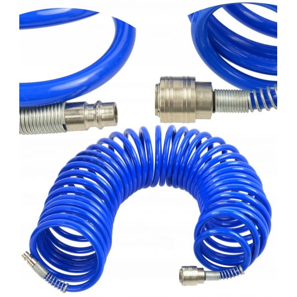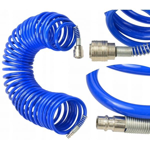 Wysokiej jakości przewód spiralny o długości 15 metrów. Przewód wykonano z odpornego na zginanie i ścieranie poliuretanu. Służy do podłączenia narzędzi pneumatycznych do kompresora. Przewód jest kompletny, okuty w standardowe szybkozłącze i wtyczkę.