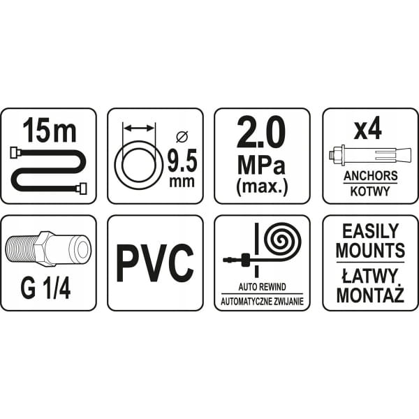 Przewód pneumatyczny o długości 15 metrów na zwijaku automatycznym. Niezbędny do zasilania narzędzi pneumatycznych. Przydatny w każdym warsztacie i zakładzie produkcyjnym.
