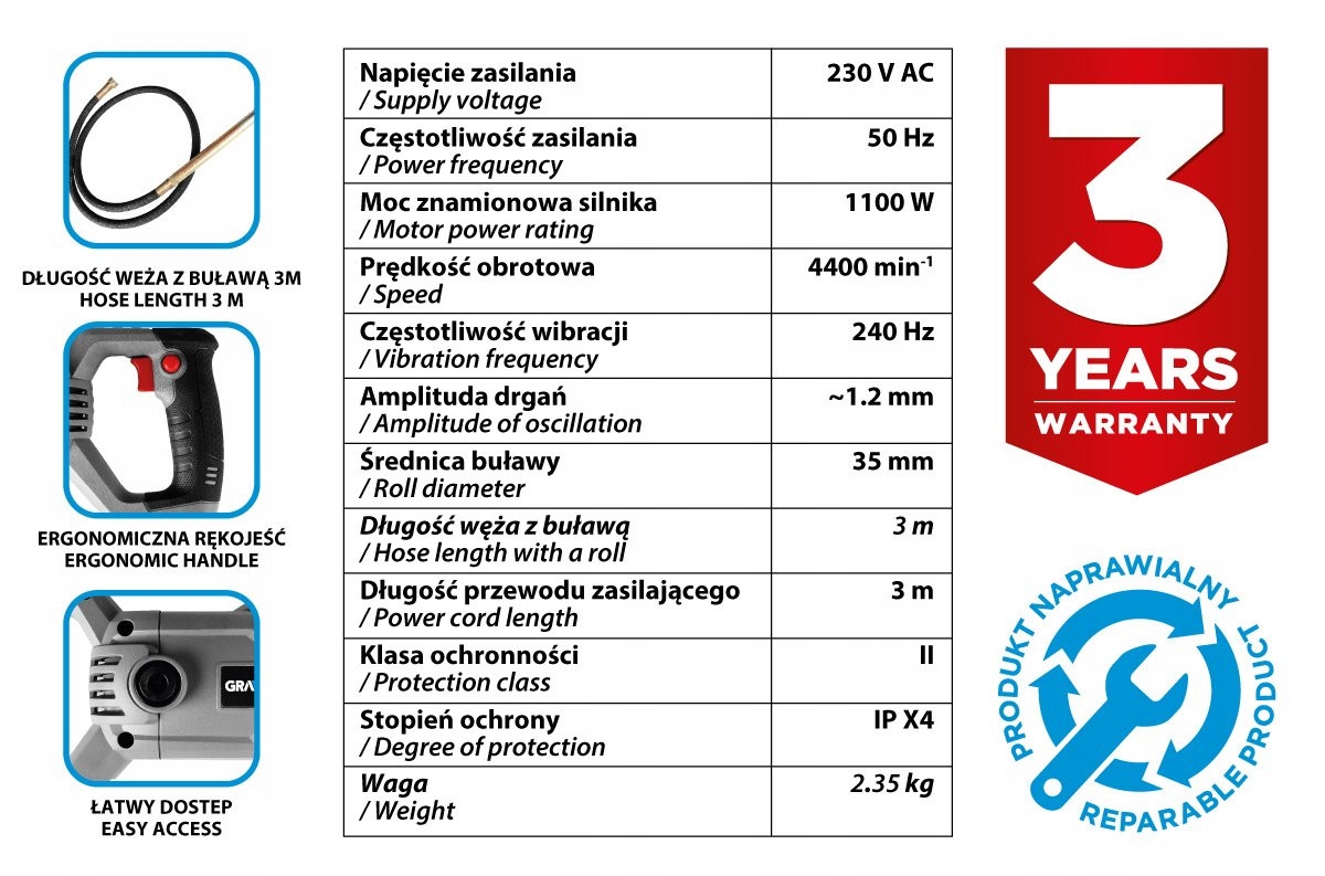 Wibrator do betonu marki GRAPHITE o mocy 1100 W z buławą o długości 3 metrów to niezbędne narzędzie dla każdego profesjonalisty zajmującego się pracami budowlanymi i konstrukcyjnymi. Urządzenie to, charakteryzujące się prędkością 4400 obrotów na minutę, zapewnia efektywne zagęszczanie betonu, eliminując pęcherze powietrza i zapobiegając powstawaniu słabych punktów w konstrukcji. Dzięki 3-metrowemu przewodowi zasilającemu, narzędzie to oferuje wyjątkową swobodę ruchu i pozwala na pracę w trudno dostępnych miejscach bez konieczności ciągłego przestawiania urządzenia.