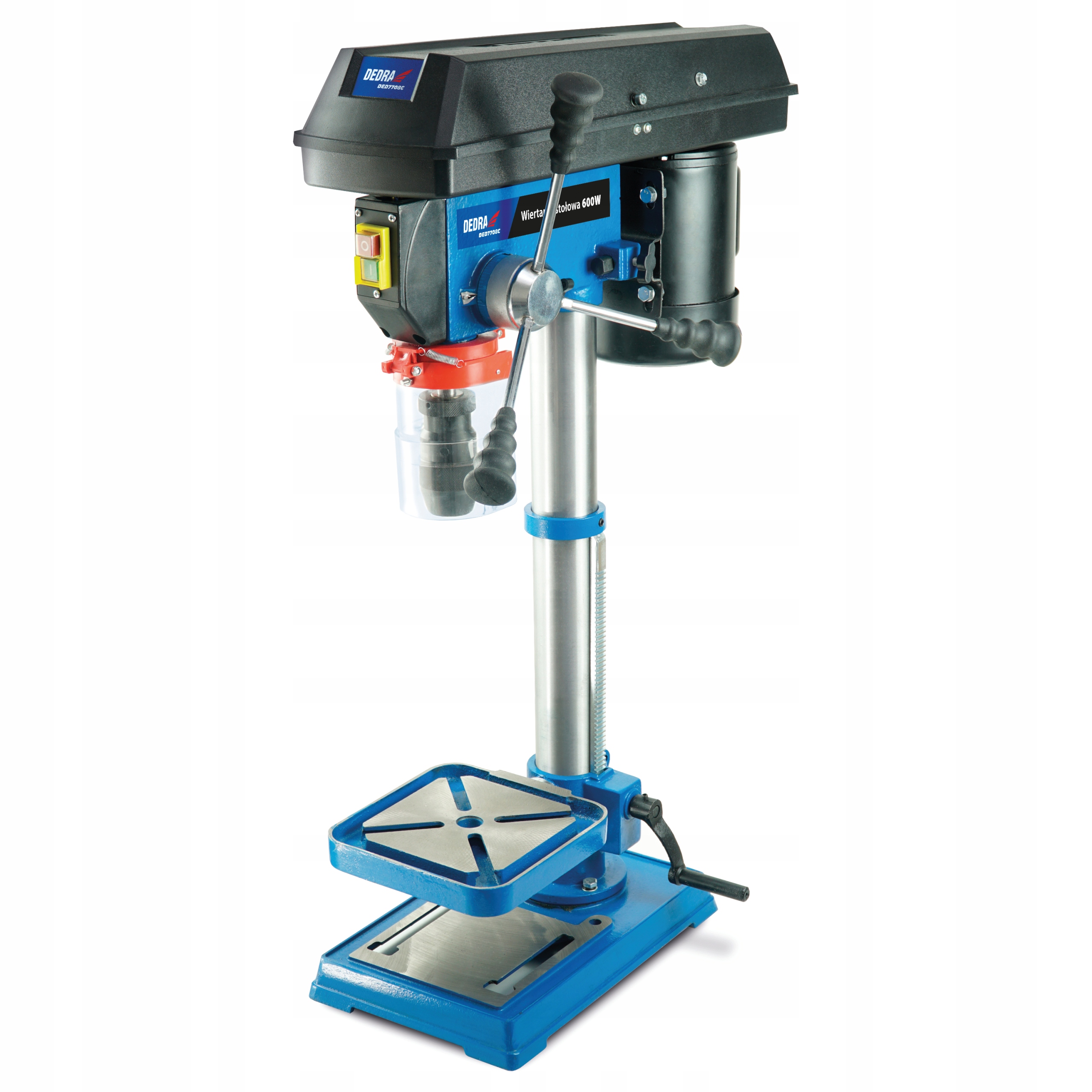 Wiertarka stołowa DED7708C wyposażona została w dwa blaty robocze. Wysokość jednego z nich jesteśmy w stanie regulować za pomocą pokrętła oraz dodatkowo regulować w zakresie wychylenia 0-90°. Wiertarka posiada pięcio-stopniowe przełożenie, co pozwala nam dobrać odpowiednią prędkość obrotową podczas wykonywaniu otworu.