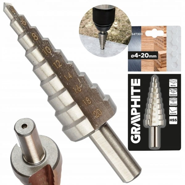 GRAPHITE WIERTŁO STOPNIOWE STOŻKOWE CHOINKOWE 4-20MM DREWNA PLASTIKU 54T303
