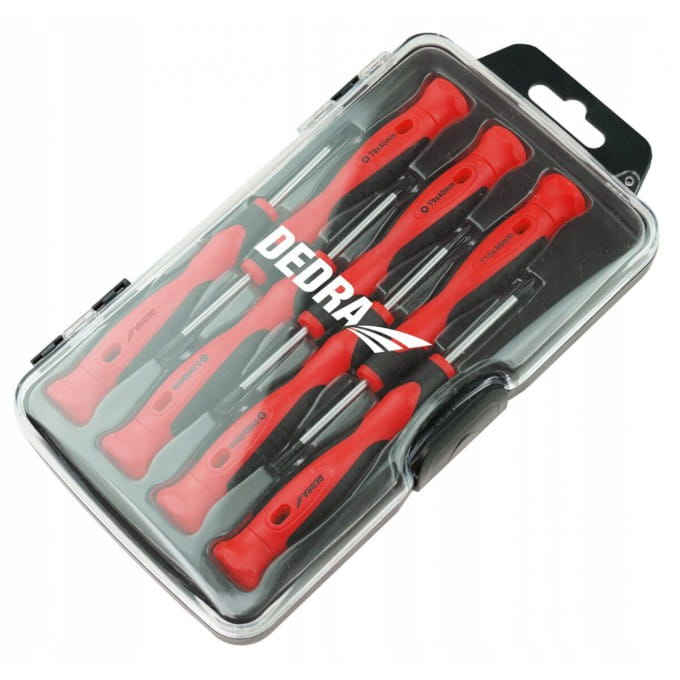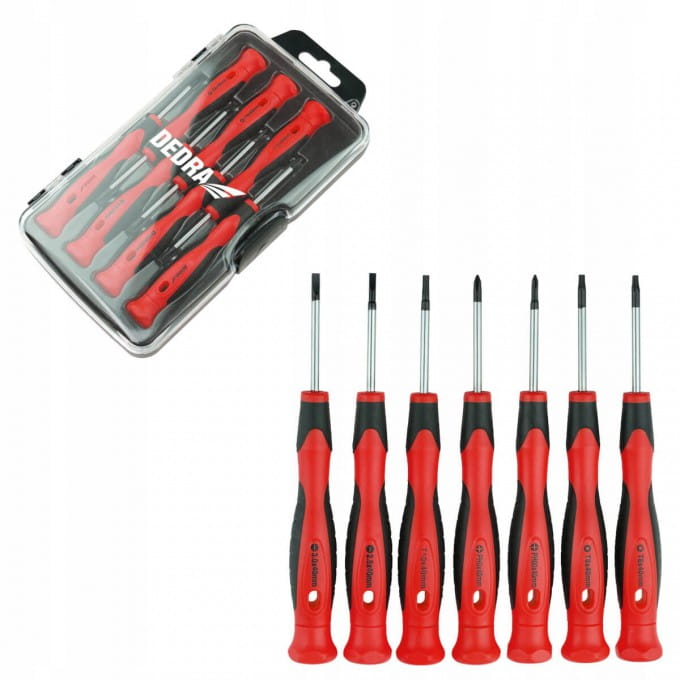 Zestaw 7 sztuk wkrętaków precyzyjnych które znajdą zastosowanie przy pracach elekrycznych, jubilerskich czy naprawie sprzętu AGD. Wkrętaki wykonane zostały ze stali chromowo wanadowej zapewniającej im odpowiednią twardość i trwałość. Wygodny uchwyt wykonany z gumy zapewnia użytkownikowy pewny chwyt podczas pracy. Dodatkowo wkrętaki posiadają magnetyczne końcówki, co znacząco ułatwia wkręcanie oraz wykręcanie.