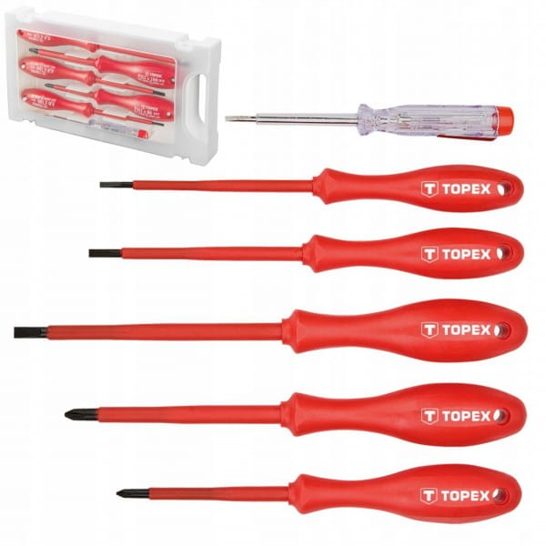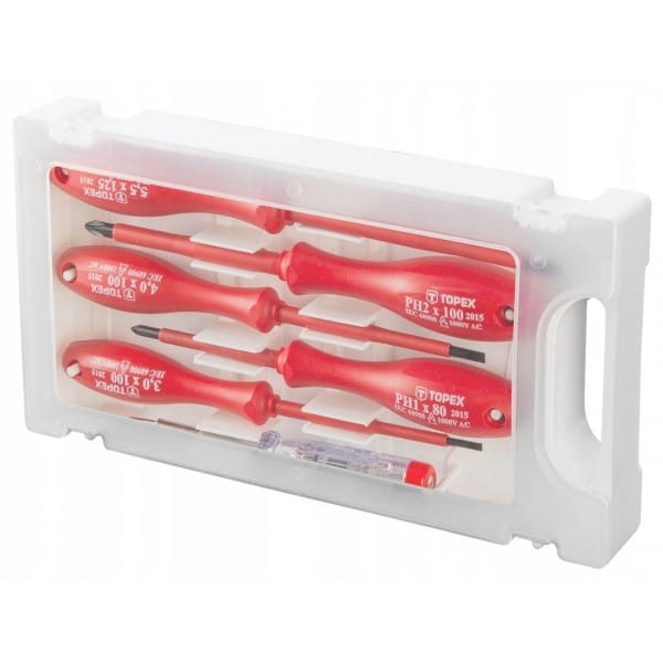 Zestaw wkrętaków TOPEX (nr ref. 39D155) przeznaczonych do prac pod napięciem do 1000V. Każdy z pięciu wkrętaków wykonany z wysokiej jakości stali chromowo-molibdenowej, izolowany. Dodatkowo w komplecie próbnik instalacji elektrycznej 125 - 250V. Wyprofilowana rękojeść prawidłowo leży w dłoni, co podnosi komfort pracy. Marka TOPEX skierowana jest do majsterkowiczów.