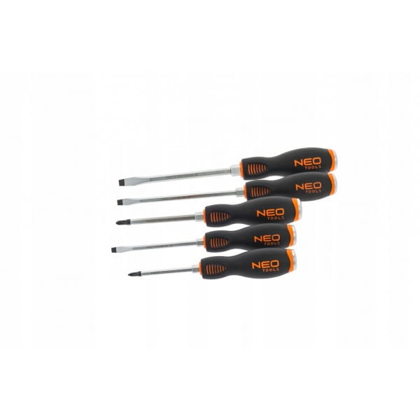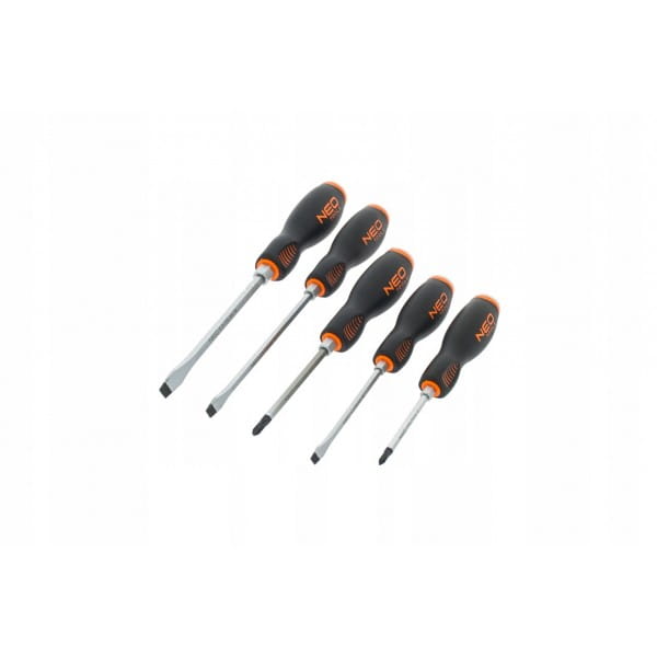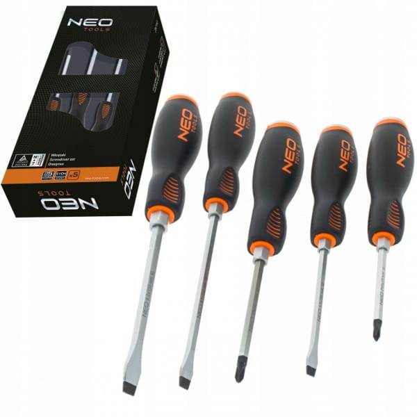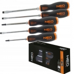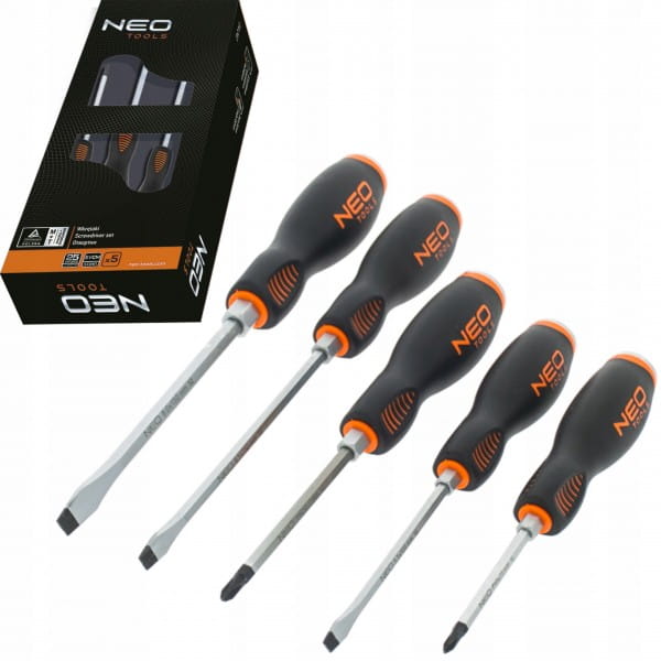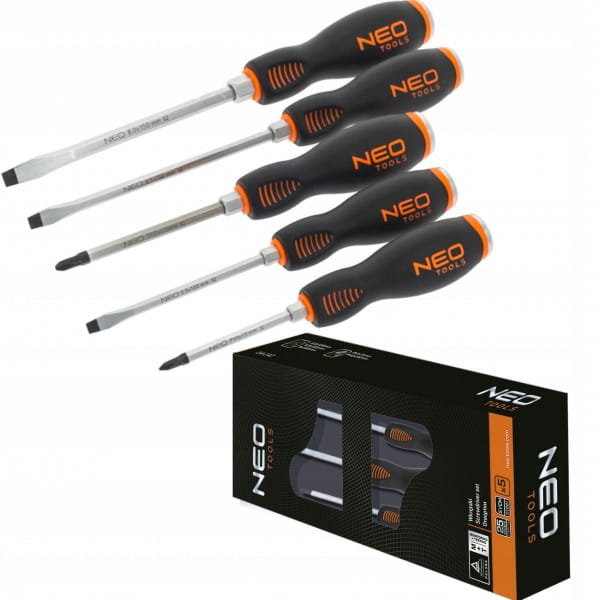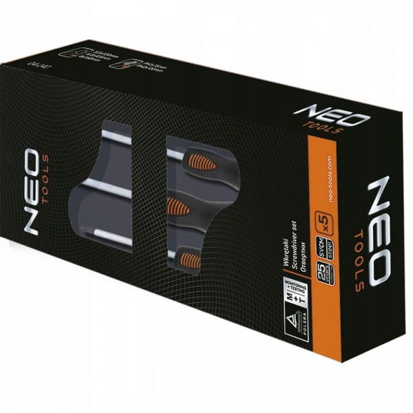Zestaw wkrętaków do pobijania NEO (nr ref. 04-240) zawiera 5 wkrętaków: płaskich i krzyżowych. Grot wkrętaka wykonany jest z wyjątkowo wytrzymałej stali S2. Końcówka robocza grota została poddana obróbce cieplnej, dzięki czemu uzyskano odpowiednią twardość i odporność na zgięcia 56 HRC. Wkrętak posiada magnetyczną końcówkę i uchwyt do pobijania. Trójgraniasty kształt uchwytu z wyprofilowanym oparciem dla kciuka zmniejsza obciążenie dłoni podczas pracy i ułatwia uzyskanie optymalnego momentu obrotowego. Dwumateriałowy uchwyt zapobiega ślizganiu się w dłoni, odporny jest na działanie chemikaliów, olejów i smarów. Jakość narzędzia potwierdzona certyfikatem TÜV i 25-letnią gwarancją producenta. Marka NEO spełnia oczekiwania profesjonalistów.