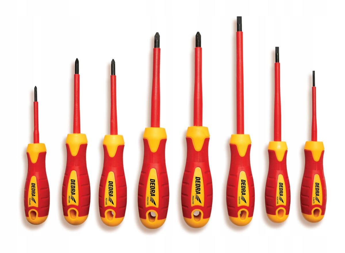 Zestaw 8 sztuk wkrętaków precyzyjnych izolowanych które znajdą zastosowanie przy pracach elektrycznych. Wkrętaki wytrzymują chronią przed napięciem prądu do 1000V. Wkrętaki wykonane zostały ze stali węglowej zapewniającej im odpowiednią twardość i trwałość. Wygodny uchwyt wykonany z gumy zapewnia użytkownikowi pewny chwyt podczas pracy. Dodatkowo wkrętaki posiadają magnetyczne końcówki, co znacząco ułatwia wkręcanie oraz wykręcanie.