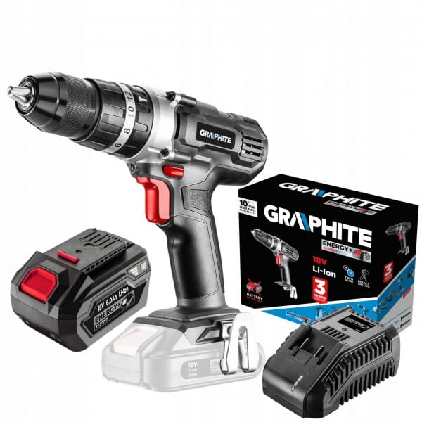Dwubiegowa wiertarko-wkrętarka GRAPHITE z udarem, współpracująca z akumulatorami 18V Li-Ion GRAPHITE Energy+. Elektronarzędzie posiada płynną regulację prędkości obrotowej oraz zostało wyposażone w przełącznik kierunku obrotów. Samozaciskowy uchwyt pozwala na stosowanie osprzętu o średnicy 2-13 mm. Maksymalna prędkość obrotowa wrzeciona na pierwszym biegu wynosi 350, a na drugim 1250 obrotów na minutę. Częstotliwość udaru mechanicznego na pierwszym biegu osiąga wartość 5250, a na drugim 18750 uderzeń na minutę. Maksymalny moment obrotowy wynosi 35 Nm (wkręcanie miękkie) / 55 Nm (twarde) i może być regulowany poprzez 16-stopniowe sprzęgło z dodatkowym szybkim przełącznikiem trybu pracy dla wkręcania, wiercenia i wiercenia z udarem. Urządzenie wyposażono w elektryczny hamulec silnika i automatyczną blokadę wrzeciona. Dioda LED, uruchamiana automatycznie, podświetla miejsce pracy. Ergonomiczny kształt rękojeści i zwarta konstrukcja wiertarko-wkrętarki pozwalają na wygodną pracę także w trudnych warunkach. Rękojeść została pokryta materiałem antypoślizgowym, dzięki czemu elektronarzędzie pewnie leży w dłoni. Przekładnia planetarna została wykonana z wysokogatunkowej stali.