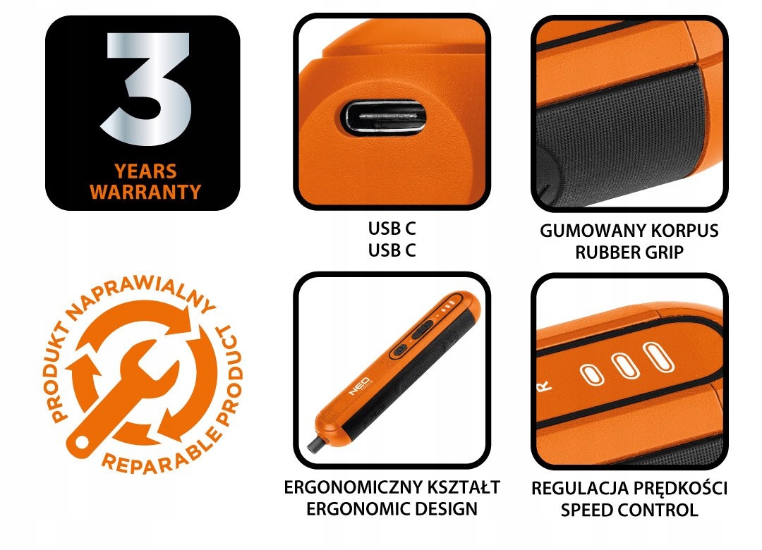 Funkcja auto start/stop, która włącza urządzenie po dociśnięciu do wkręta, oraz blokada wrzeciona zwiększają wygodę i bezpieczeństwo użytkowania. Ogumowana rękojeść, oświetlenie LED oraz wskaźnik naładowania sprawiają, że praca z tym narzędziem jest komfortowa i efektywna nawet w trudnych warunkach. Wkrętak NEO TOOLS ładowany jest przez złącze USB C. To poręczne, lekkie i wszechstronne narzędzie doskonale sprawdzi się w pracach domowych, ogrodowych, a także w profesjonalnych zastosowaniach.