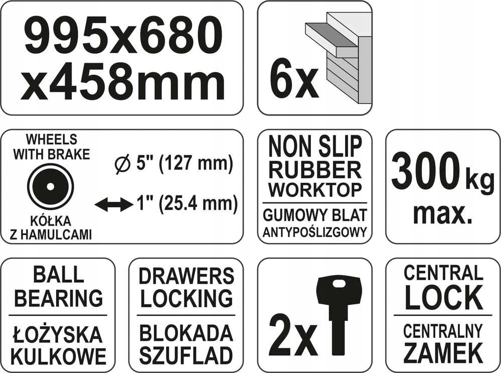 Szafka serwisowa marki YATO. Posiada 6 szuflad na prowadnicach kulkowych, wyłożonych pianką. Profile wykonane z wytrzymałej blachy stalowej. Blat wyłożony olejoodporna gumą. Szafka posiada duże gumowe koła, w tym dwa obrotowe z zabezpieczeniem. Odporna na duże obciążenia do 300 kg. Niezbędna w warsztatach samochodowych i stacjach obsługi pojazdów.