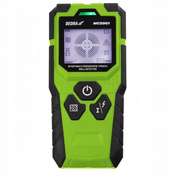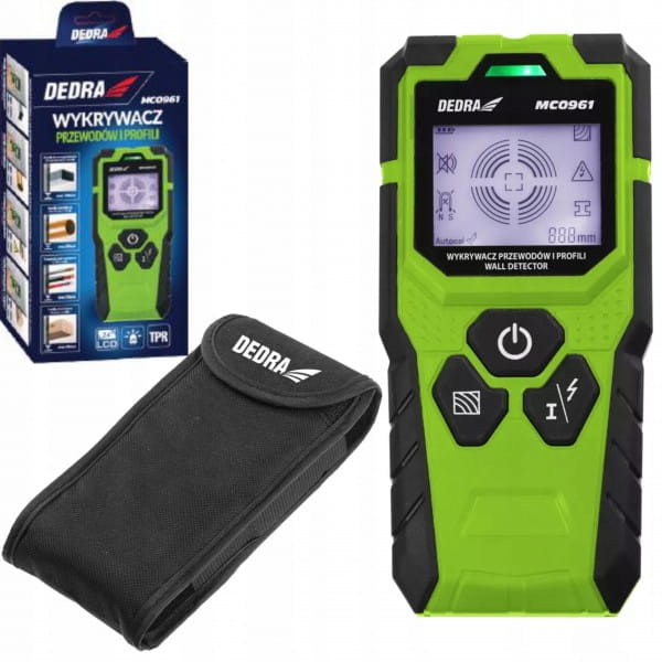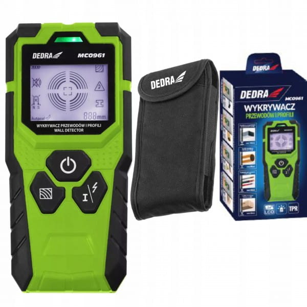 Wykrywacz przewodów i profili DEDRA MC0961 pozwala na wykrycie elementów i profili metalowych, przewodów elektrycznych bez i pod napięciem przemiennym oraz drewna. Pomaga tym samym uzupełnić dokumentację techniczną budynków. Czytelny, podświetlany wyświetlacz LED pozwala na sprawną interpretację wykrytych elementów, a sygnalizująca dioda (w trzech kolorach: zielony, żółty, czerwony) wskazuje natrafienie na szukany element. Dodatkowo wykrywacz przewodów posiada sygnał dźwiękowy, aby nie umknął Ci żaden alert. W zestawie z urządzeniem znajdziesz pokrowiec, uchwyt do pasa, baterię 9V oraz instrukcję obsługi.