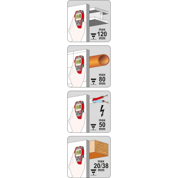 Zastosowanie wykrywacza i miernika 4 w 1 marki YATO YT-73138 znacznie przyspiesza pracę, zwiększa bezpieczeństwo oraz minimalizuje ryzyko przypadkowego uszkodzenia instalacji elektrycznej czy hydraulicznej umieszczonej pod tynkiem. Dzięki niemu można m.in. bezpiecznie wywiercić otwór czy odnaleźć miejsce na wkręcenie wkręta w ukryty pod płytą kartonowo-gipsową profil drewniany lub metalowy. Wbudowany miernik wilgotności umożliwi m.in. określenie poziomu zawilgocenia tynku w mostkach termicznych, a także sprawdzenie wilgotności dla drewna przeznaczonego na opał.