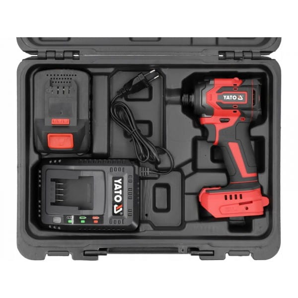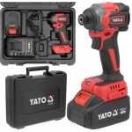 Bezszczotkowa zakrętarka udarowa zasilana akumulatorem platformy YATO 18V. Jej główną zaletą jest bardzo krótki korpus o długości 90 mm. Dzięki temu pozwala na pracę w trudno dostępnych miejscach i prostopadłe dociskanie wkrętu do materiału. 4-stopniowa regulacja momentu dokręcającego i odkręcającego chroni użytkownika przed zrywaniem i przegłębianiem śrub. Udar styczny zabezpiecza przed przeskakiwaniem bita podczas wkręcania. Zakrętarka wyposażona jest w trwały uchwyt narzędziowy hex. Zakrętarka posiada zabezpieczenie termiczne chroniące przed przeciążeniem.