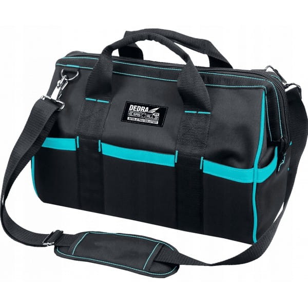 Torba narzędziowa DED7001 o pojemności 24 l. Torba wykonana jest z wytrzymałego nieprzemakalnego dwuwarstwowego poliestru 600D, który zapewnia odporność produktu na uszkodzenia mechaniczne ale również ochroni narzędzia podczas transportu. Torba zamykana jest na zamek błyskawiczny i wyposażona w regulowany pas naramienny.