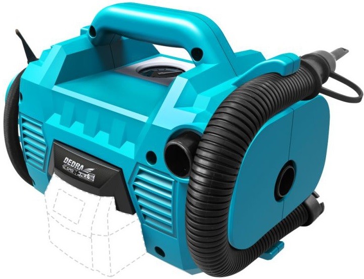 Kompresor powietrza akumulatorowy DED7073 to urządzenie przeznaczone do pompowania kół, piłek, materacy. Ciśnienie pracy wynoszące 10BAR oraz przepływ powietrza wynoszący 235l/min sprawia że kompresor  jest bardzo wydajny. Wbudowany manometr pozwoli kontrolować ciśnienie pracy urządzenia. W skład kompresora wchodzi zestaw czterech końcówek do pompowania oraz dodatkowy przewód przy użyciu którego z łatwością nie tylko napompujemy ale i wypompujemy powietrze np. z materacy czy basenów.
