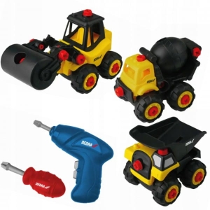 W skład tego zestawu wchodzą trzy miniatury maszyn budowlanych: walec, betoniarka oraz wywrotka, a także narzędzia, które ucieszą każdego małego majsterkowicza: wkrętarka oraz wkrętak. Jednak to nie wszystko, co czyni tę zabawkę wyjątkową - wyróżnia ją to, że każda z maszyn wymaga samodzielnego złożenia, a to z kolei doskonały sposób na rozwijanie zdolności manualnych u dziecka. Proces składania tych miniaturowych maszyn stanowi nie tylko fascynującą zabawę, ale także stymuluje rozwój kreatywności, wyobraźni oraz logicznego myślenia dziecka.