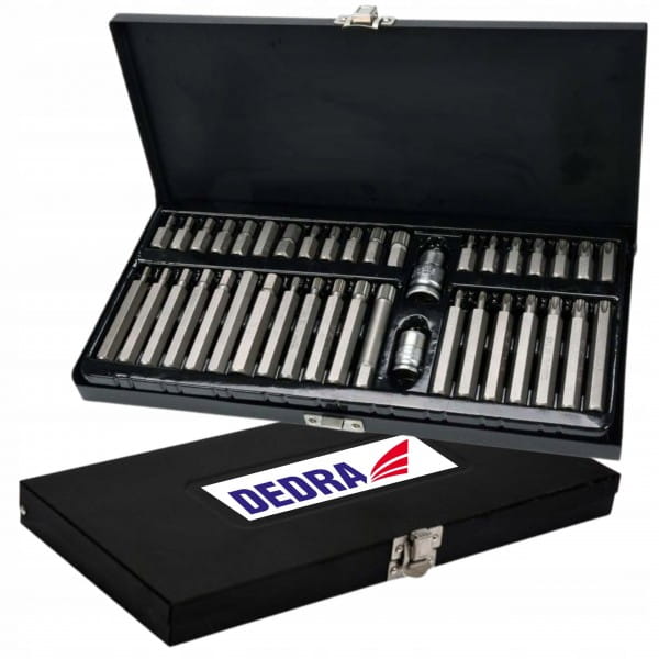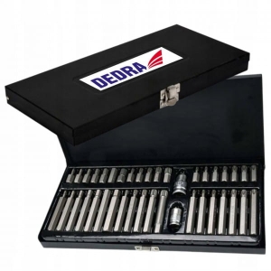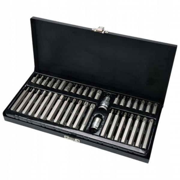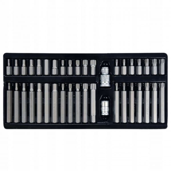 Zestaw 40 szt. końcówek wkrętakowych. W skłąd zestawu wchodzą Końcówki TORX, HEX oraz SPLINE w długości 30 i 75mm. Końcówki wykonane zostały z wytrzymałej stali chromowo wanadowej, która gwarantuje końcówkom odpowiednią trwałość i odporność na korozję. Całość zamknięta w metalowej poręcznej walizce.