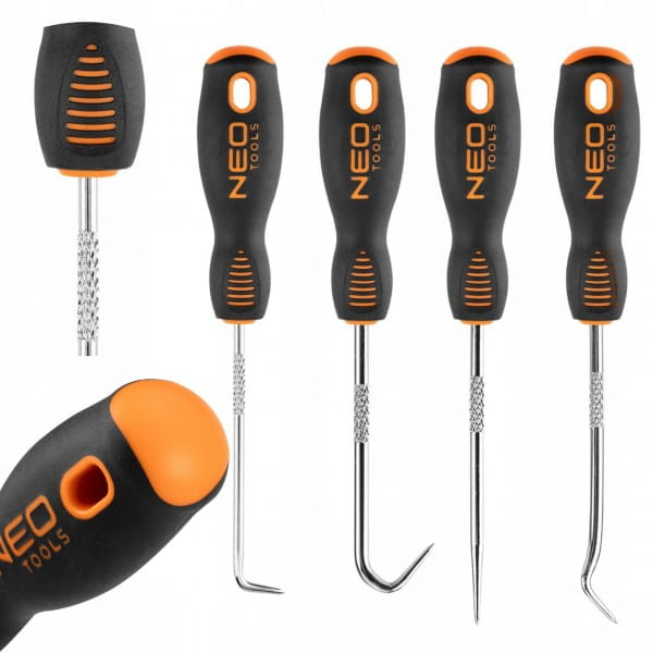 Haki 150 mm, zestaw 4 szt. 04-231 marki NEO to komplet czterech narzędzi o długości 150 mm, przeznaczonych do wyjmowania uszczelek. Posiadają wygodną rękojeść wkrętakową, której nadano trójgraniasty, ergonomiczny kształt. Dodatkowo, znalazło się w niej wyprofilowane oparcie dla kciuka, które wpływa na mniejsze obciążenie dłoni podczas wykonywanych zadań oraz pozwala uzyskać swobodę działania. Grot wykonano ze stali węglowej, z kolei uchwyt pokryto tworzywem TPR - odpornym na działanie chemikaliów, smarów i olejów mineralnych. Zestaw haków od marki NEO przeznaczony jest dla mechaników, budowlańców i majsterkowiczów.