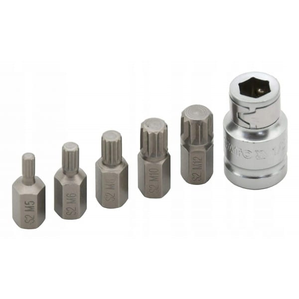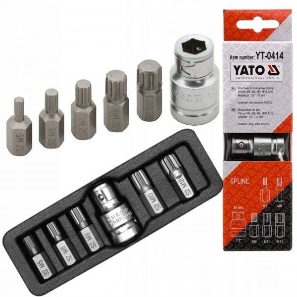 Profesjonalny zestaw YATO, służący do odkręcania śrub typu spline. Różnorodność rozmiarów bitów zapewnia możliwość wykonania wielu prac w specjalistycznych serwisach mechanicznych i samochodowych. Końcówki o długości 30 mm, mocowane są w uchwycie sześciokątnym 10 mm, dostosowanym do współpracy z grzechotką 1/2". Zestaw wykonany z najwyższej jakości stali narzędziowej S2, która charakteryzuje się: