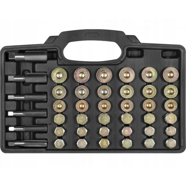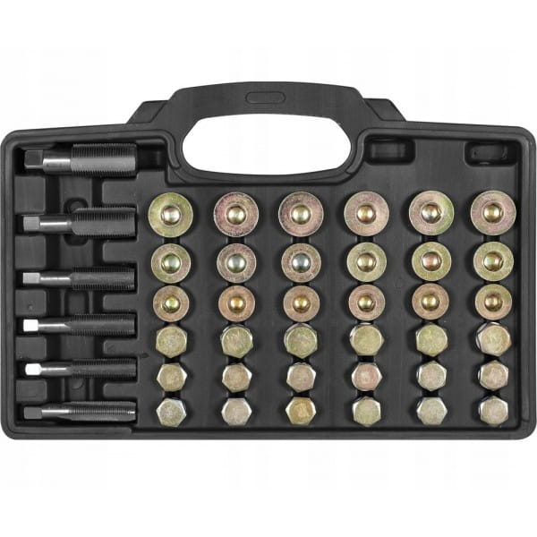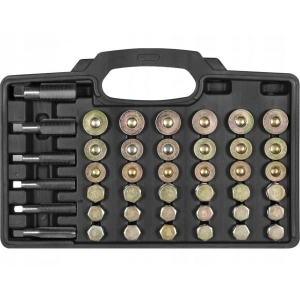 Zestaw naprawczy korków miski olejowej do zastosowania w serwisach mechanicznych, ślusarskich i motoryzacyjnych. Przeznaczony jest do naprawy sześciu różnych rodzajów gwintów M13 x 1.25, M13 x 1.5, M15 x 1.5, M17 x 1.5, M20 x 1.5, M22 x 1.5.