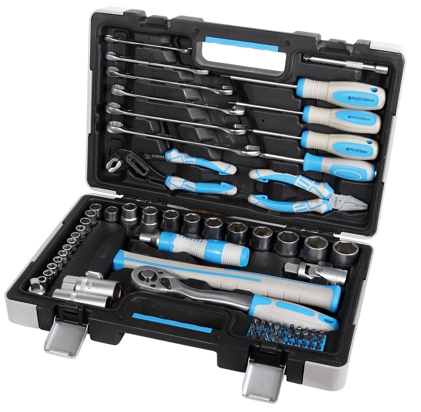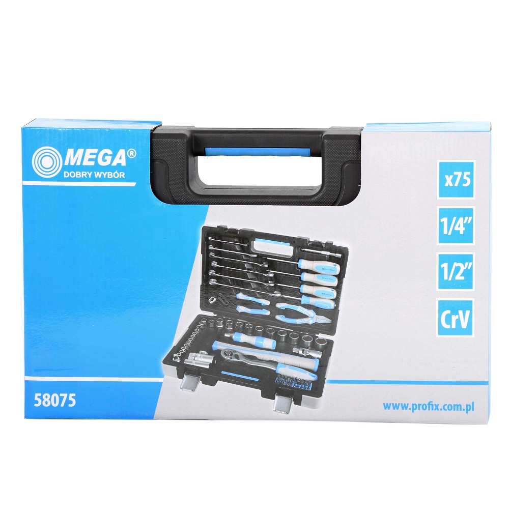 Zestaw narzędzi Mega 58075 zawiera akcesoria do różnorodnych prac domowych i warsztatowych. Szeroki zakres akcesoriów o różnych rozmiarach umożliwi wszechstronne działanie. Zestaw 58075 składa się z 75 części wykonanych z bardzo wysokiej jakościstali chromowo-wanadowej o twardości 31 CrV z zawartością związków węgla dla zachowania wysokiej twardości w całym przekroju narzędzia. Szczypce, wkrętaki, młotki, klucze zostały wyposażone w ergonomiczne rękojeści dla wygodnego użytkowania. Grzechotka dostarczona w zestawie posiada72 zęby co zdecydowanie ułatwia pracę. Cały zestaw dostarczany jest w walizce transportowej co ułatwia transport. W stosunkowo niewielkiej walizce (Długość-39cm, Szerokość-25cm, Wysokość-8cm) mamy większość potrzebnych narzędzi, które używamy przy pracach domowych.Różnorodna konfiguracja zestawu sprawia, że zestaw znajduje zastosowanie zarówno przy pracach warsztatowych, montażowych czy w pracach przy gospodarstwie domowym.