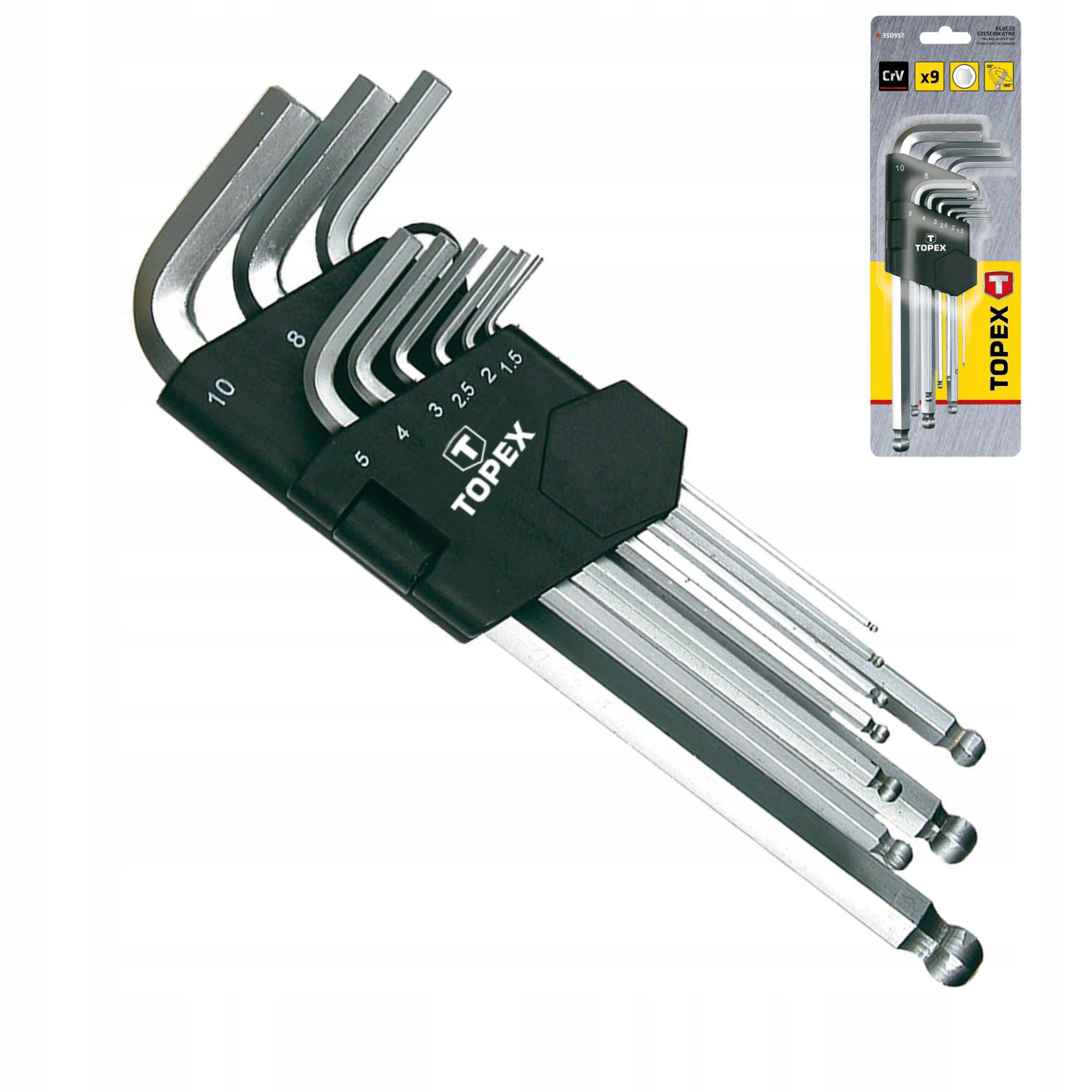 Klucze sześciokątne długie TOPEX (nr ref. 35D957) w rozmiarach 1.5 - 10 mm. Wykonane z wytrzymałej stali chromowo-wanadowej, zapewniającej długą żywotność produktu. Kuliste końcówki o kącie pracy 30° umożliwiają pracę w trudnych miejscach. Praktyczne opakowanie z tworzywa sztucznego, z oznaczoną przegródką na każdy klucz ułatwia ich przechowywanie. Marka TOPEX skierowana jest do majsterkowiczów.