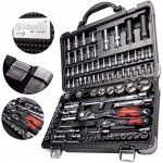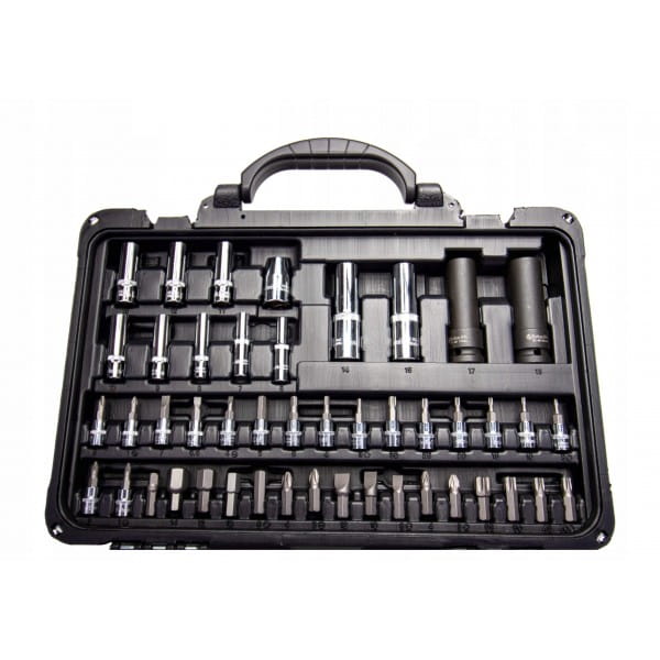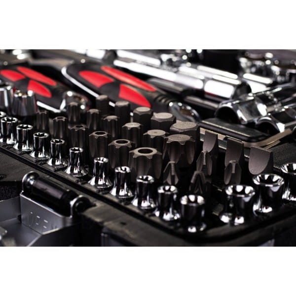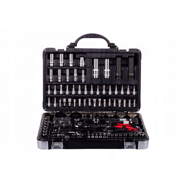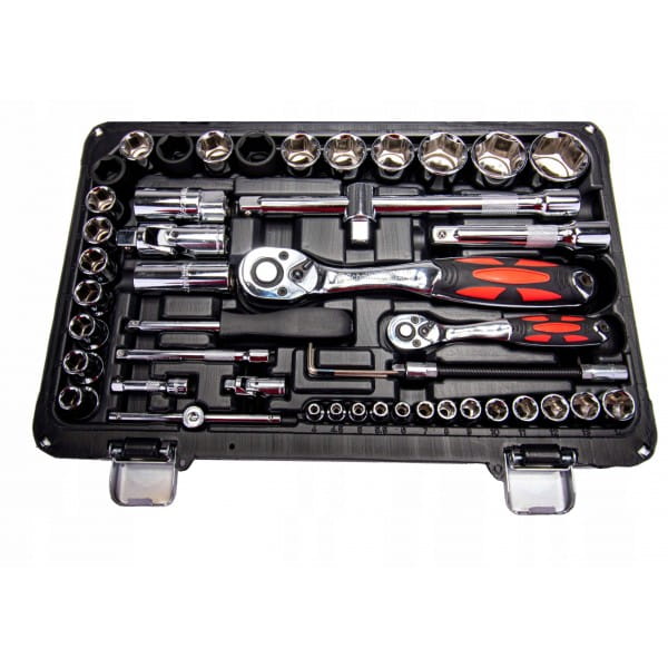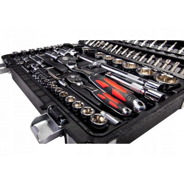 Zestaw kluczy nasadowych w walizce 94 części wykonanych ze stopu stali CR-V wytrzymałej na naprężenia statyczne i kinetyczne. Unikalna powłoka na powierzchni znacząco zwiększa komfort pracy oraz pozwala na utrzymanie narzędzi w czystości. Praktyczna i solidna walizka z tworzywa sztucznego z metalowymi zatrzaskami i poręcznym uchwytem.