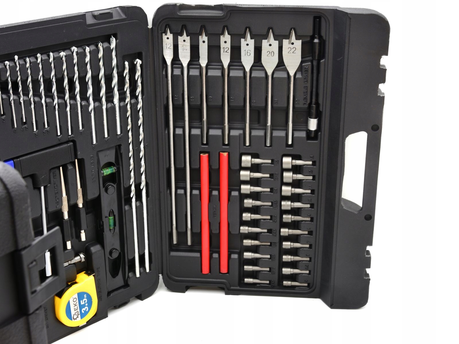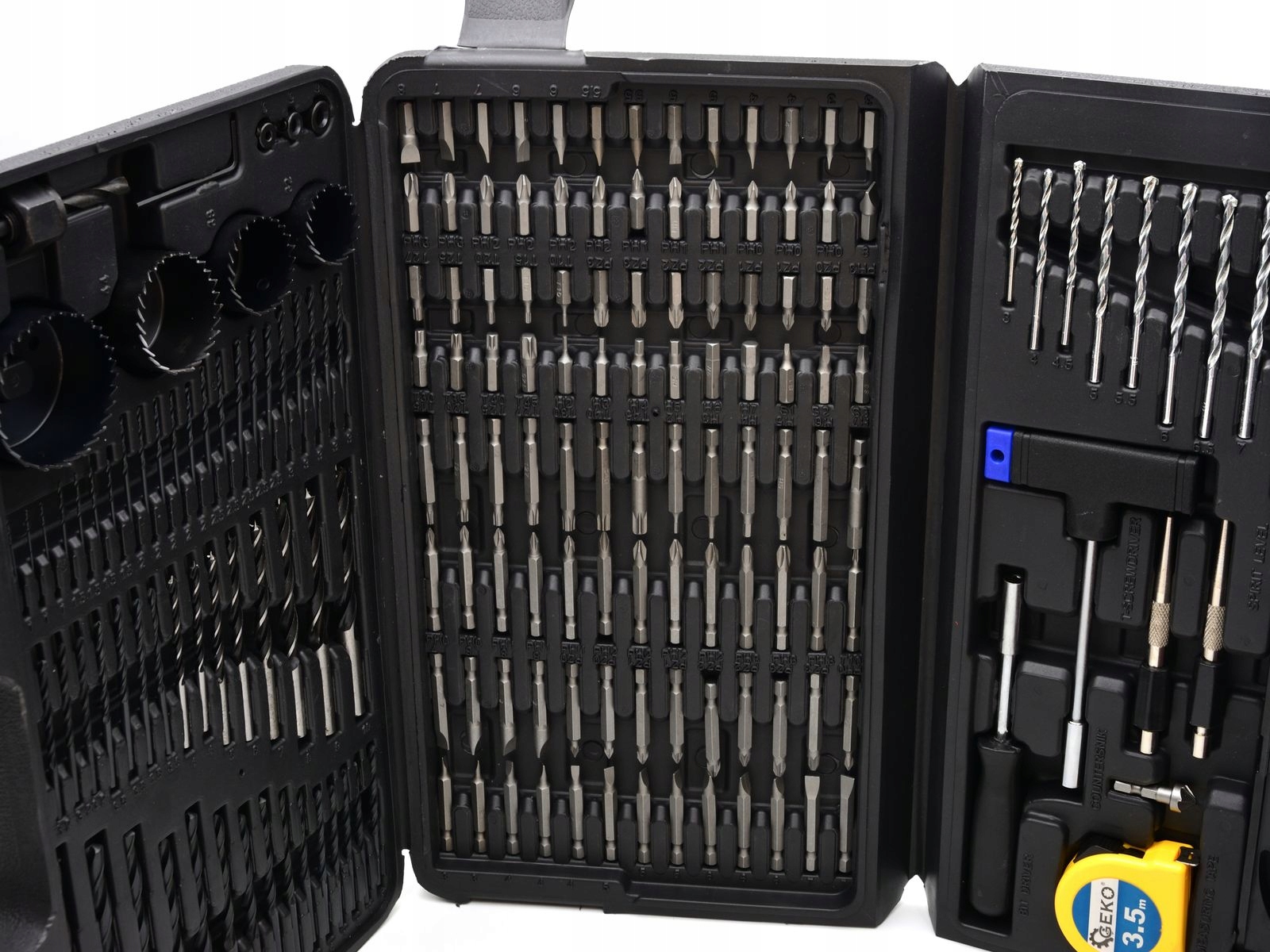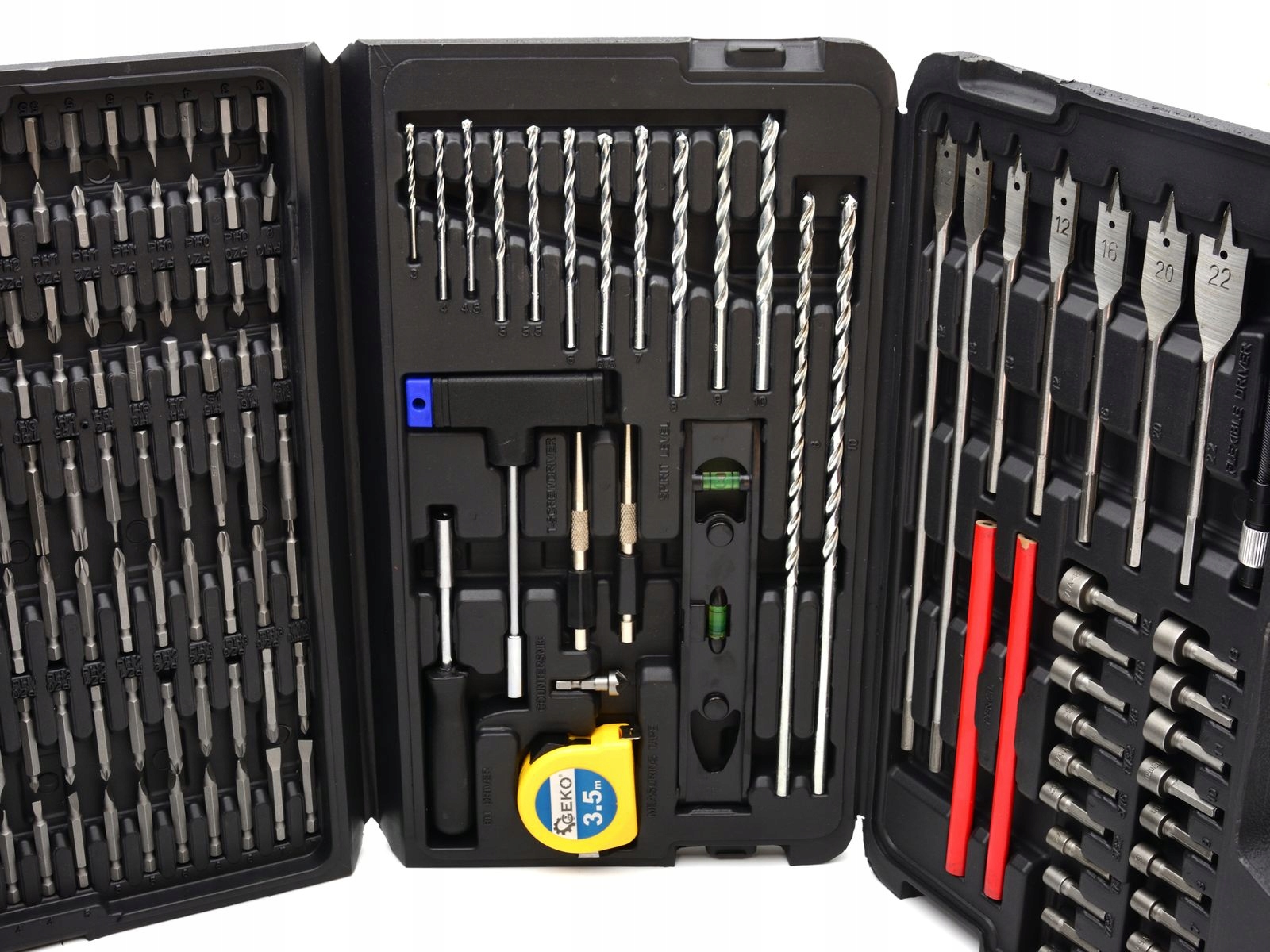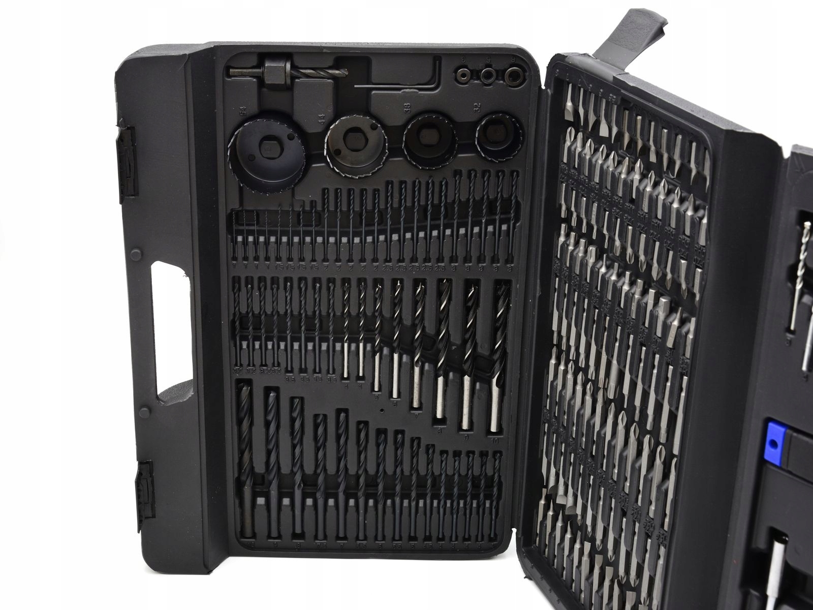 Uniwersalny zestaw akcesoriów. Idealny dla majsterkowiczów. Zawiera ponad 100 końcówek do wkrętarek, ponad 70 wierteł i asortyment narzędzi ręcznych.