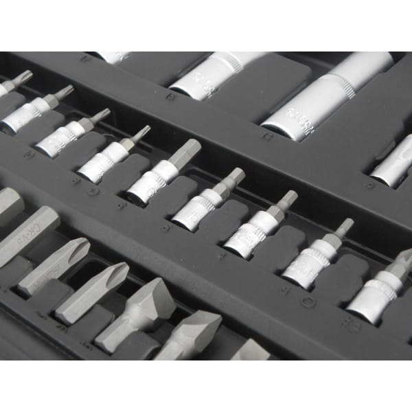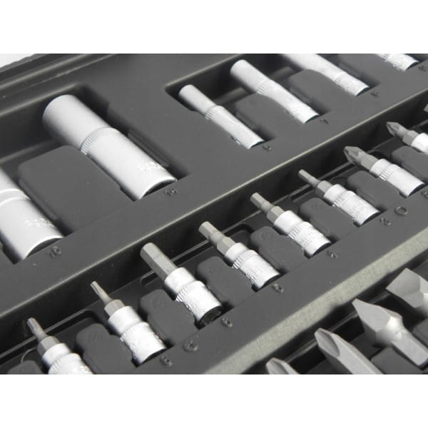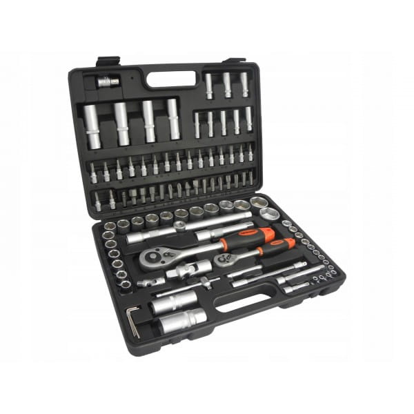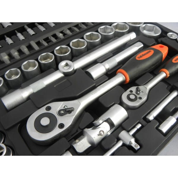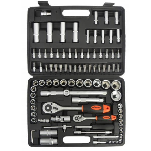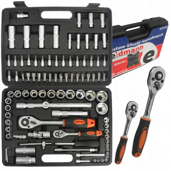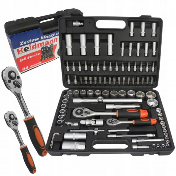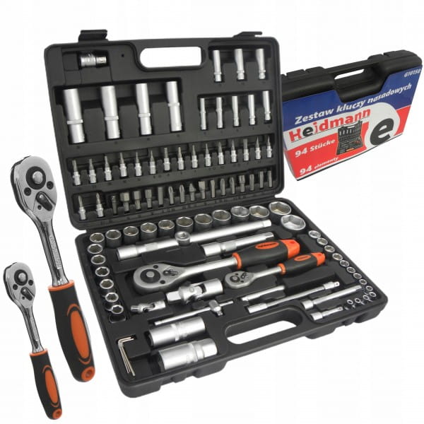 Zestaw kluczy marki Heidmann składający sie z 94 elementów. Znaleźć w nim można pakiet nasadek i końcówek wkrętakowych oraz grzechotki 1/2" i 1/4" z 24 zębami. Zestaw zawiera bity na nasadki oraz dedykowany do nich wkrętak. Wszystkie elementy tego zestawu wykonane są z wysokiej jakości stali chromowo-wanadowej CrV. Całość umieszczona jest w poręcznej walizce wykonanej z wytrzymałego tworzywa sztucznego.