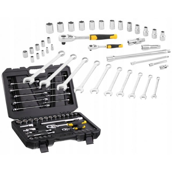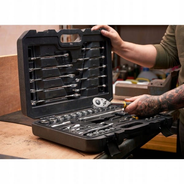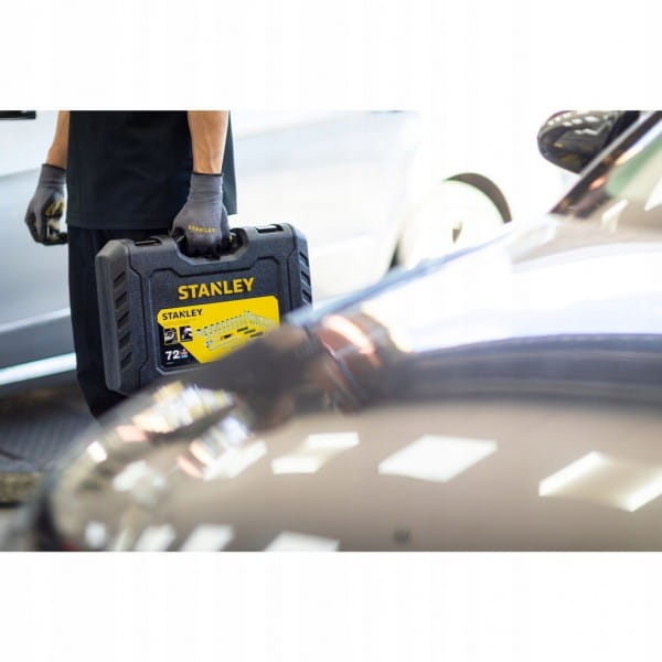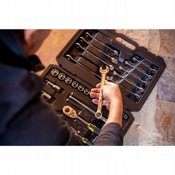 Zestaw kluczy nasadowych, płaskich 41 szt. STMT82832-1 Stanley to zestaw zawierający dwie grzechotki, pierwszą, ćwierć calową grzechotkę z 72 zębami, dwie kompatybilne przedłużki o długości 75 oraz 125 mm, jeden przegub uniwersalny oraz 10 nasadek sześciokątnych o rozmiarach od 5,5 do 14 mm. Drugą część zestawu stanowią części kompatybilne do grzechotki 1/2 cala, w której skład wchodzą 2 przdłużki, przegub uniwersalny oraz 13 nasadek 1/2" o wielkości od 10 do 24 mm.