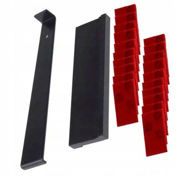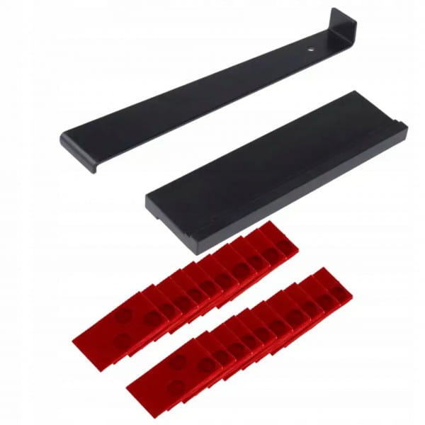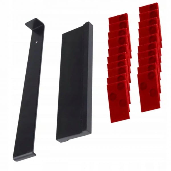 W skład zestawu wchodzi 20 sztuk klinów (30x58x5mm), jeden dobijak oraz jedna prowadnica dociągająca, a wszystkie jego elementy wykonane zostały z tworzywa sztucznego o wysokiej jakości, co zapewnia ich trwałość i wytrzymałość. Powierzchnia klinów jest gładka, co sprawia, iż łatwo w nich chwycić podłogę, a prowadnica zaprojektowana została w sposób umożliwiający prawidłowe ułożenie oraz łączenie ze sobą paneli